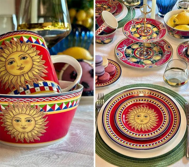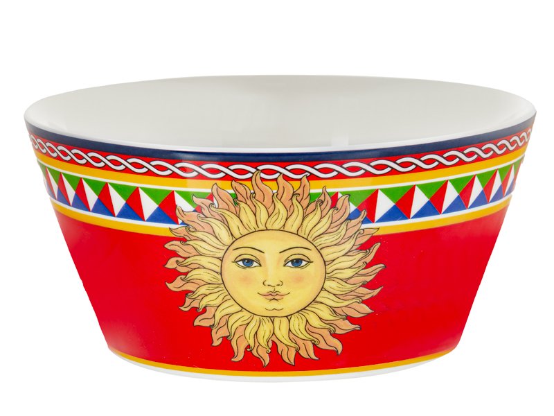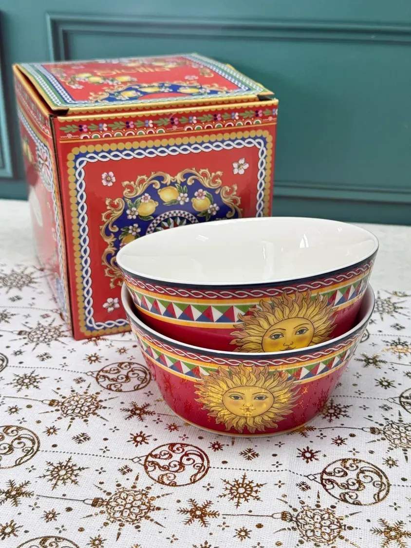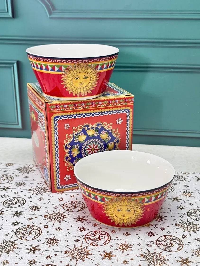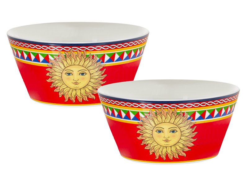 Погрузитесь в атмосферу итальянского праздника с набором из 2 фарфоровых салатников Dolche диаметром 14 см. Их яркий красный фон, солнечный орнамент и разноцветные геометрические узоры создают эффект настоящего фиеста-стола. Такой дизайн поднимет настроение и сделает любое блюдо центром внимания — от свежих салатов до десертов и фруктов.