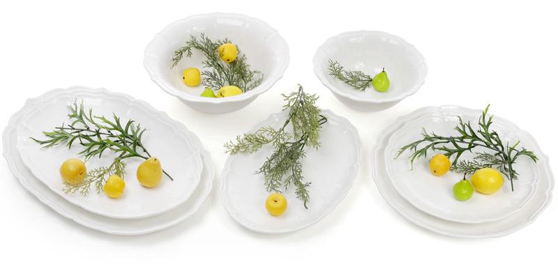 Високоякісний білий фарфор з тонким об'ємним декором, Також можуть використовуватися як великі плоскі обідні тарілки або як блюдо сервіровки,