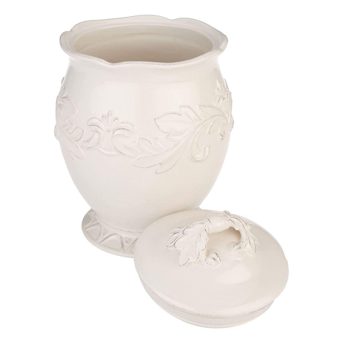 Емкости оттенка слоновой кости и их ручки украшают рельефные тиснения в виде листьев многолетнего растения аканта. Бочки из прочной керамики оснащены герметичными крышками, защищающими сыпучие продукты от сырости и насекомых.