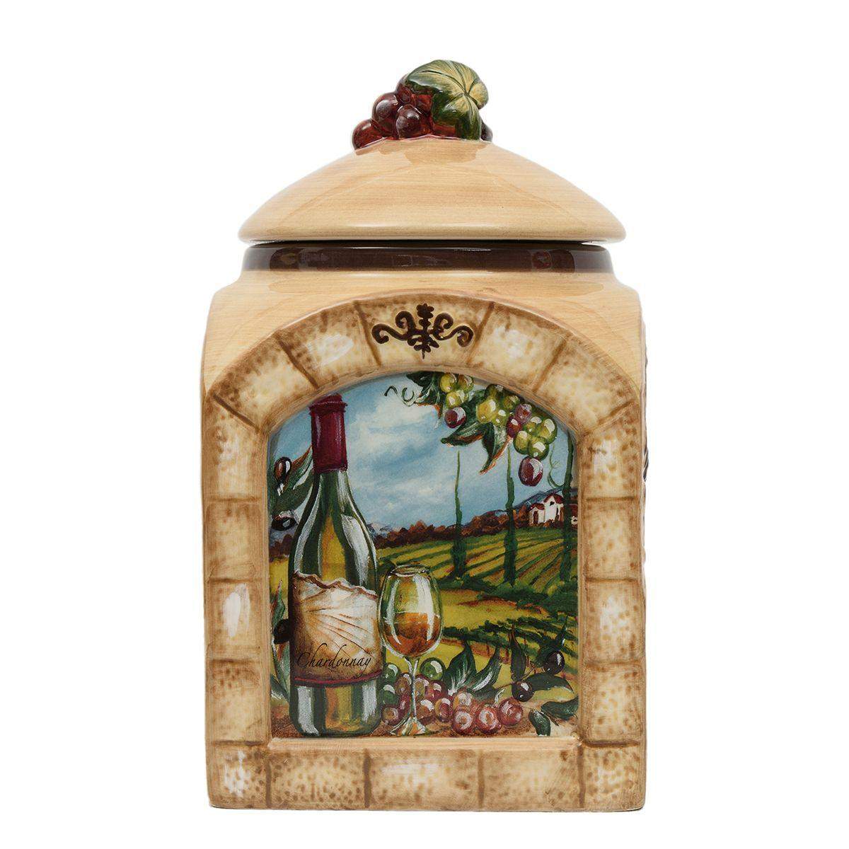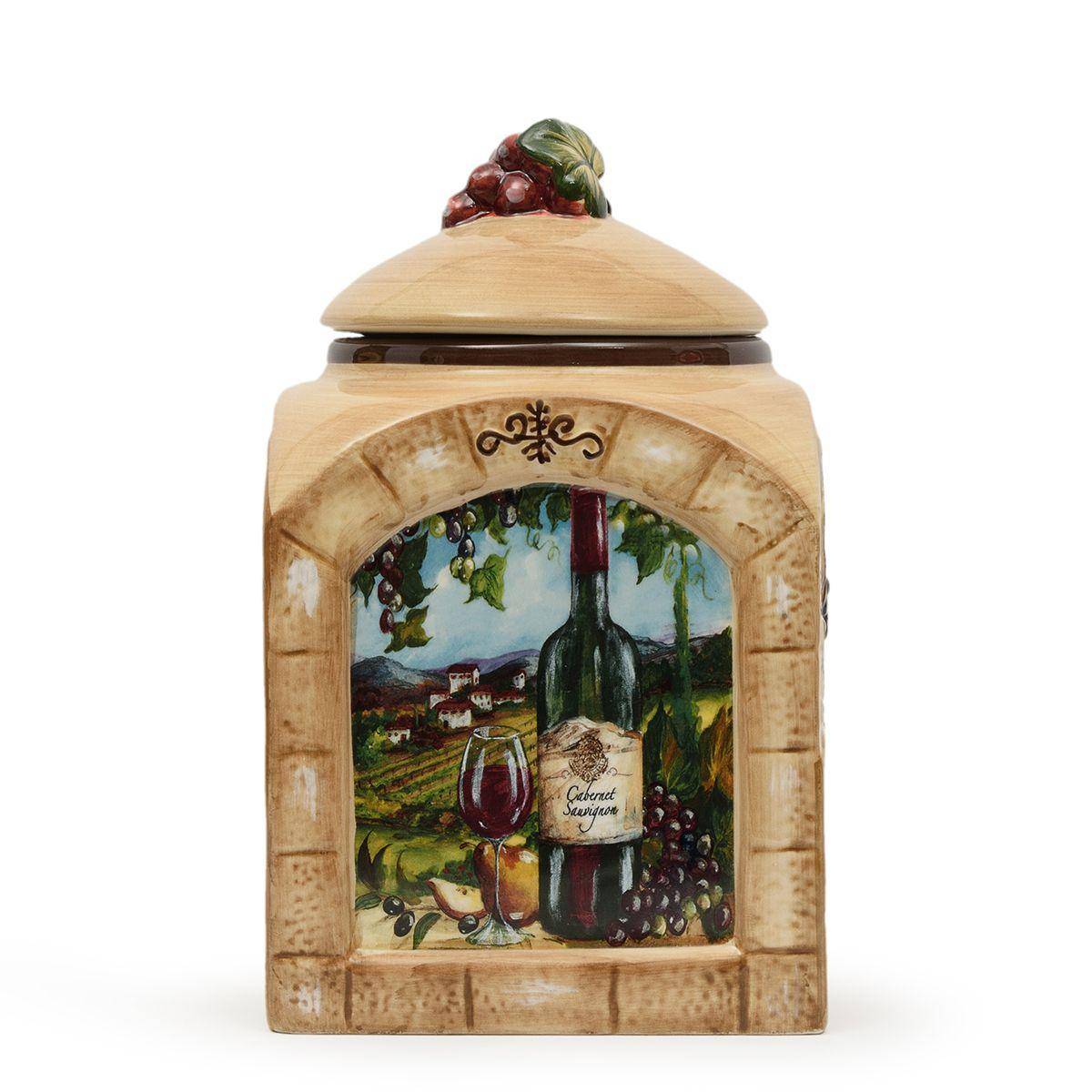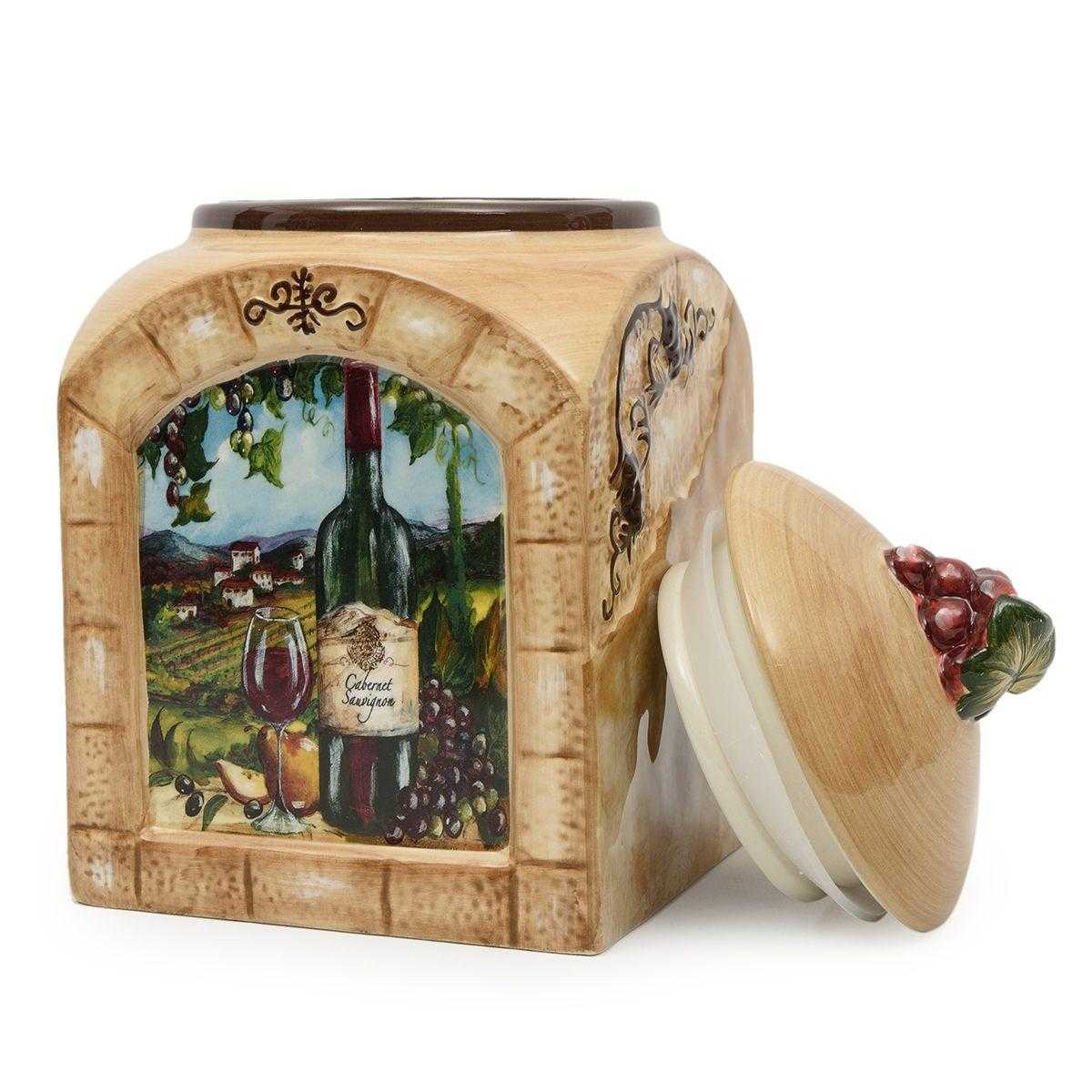 Прочные изделия из качественной керамики выполнены в форме арочных окон, через которые открывается живописный сельский пейзаж, дополненный элегантным винным натюрмортом. По бокам ёмкостей расположен объёмный декоративный рисунок, напоминающий каменную кладку и виноградную лозу. Поверхность керамики покрыта фирменной глянцевой глазурью, а герметичные крышки украшены миниатюрной гроздью винограда. Ёмкости отлично сочетаются с текстилем, стилизованным под аналогичную керамику, например со скатертями «Виноградная лоза» от Centrotex.