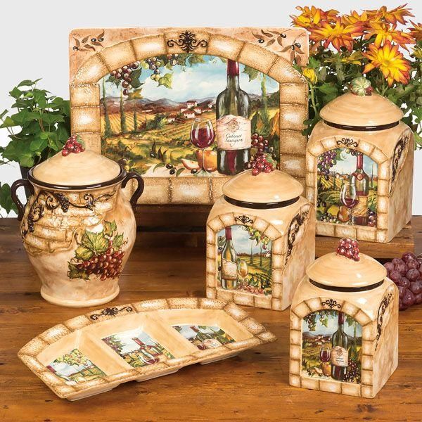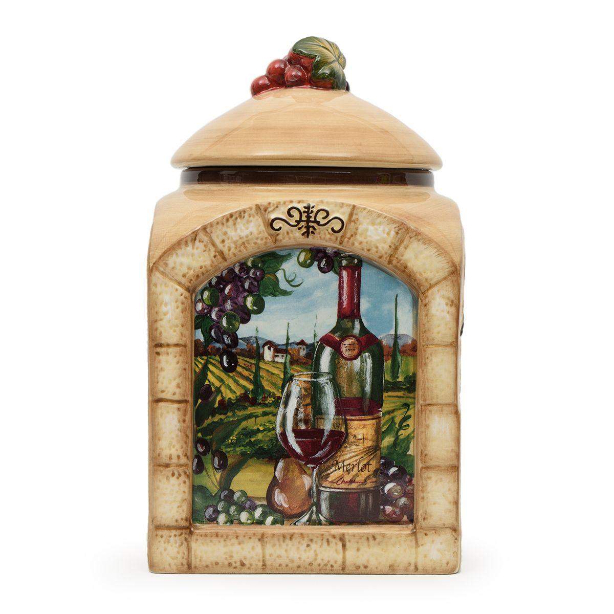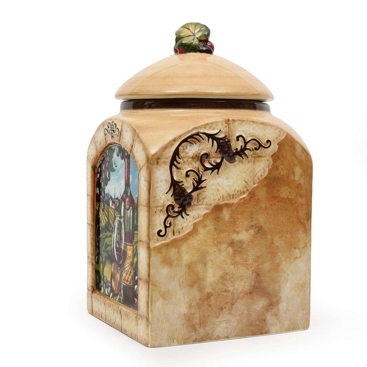 Прочные изделия из качественной керамики выполнены в форме арочных окон, через которые открывается живописный сельский пейзаж, дополненный элегантным винным натюрмортом. По бокам ёмкостей расположен объёмный декоративный рисунок, напоминающий каменную кладку и виноградную лозу. Поверхность керамики покрыта фирменной глянцевой глазурью, а герметичные крышки украшены миниатюрной гроздью винограда. Ёмкости отлично сочетаются с текстилем, стилизованным под аналогичную керамику, например со скатертями «Виноградная лоза» от Centrotex.