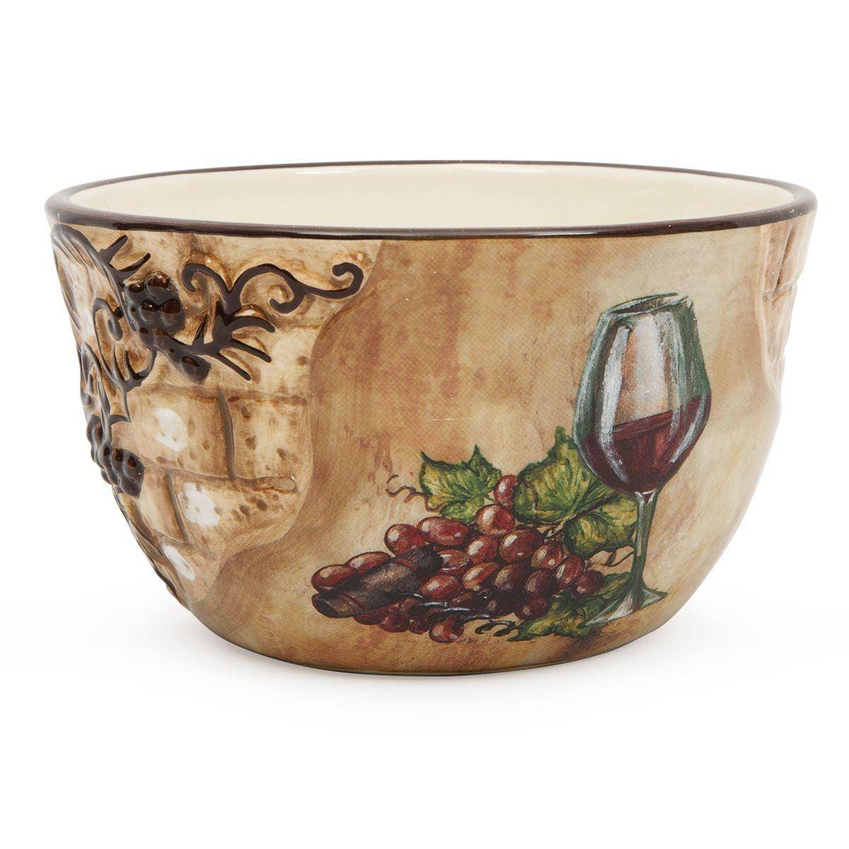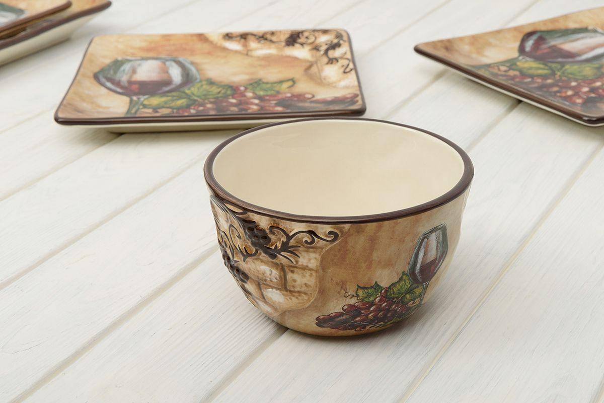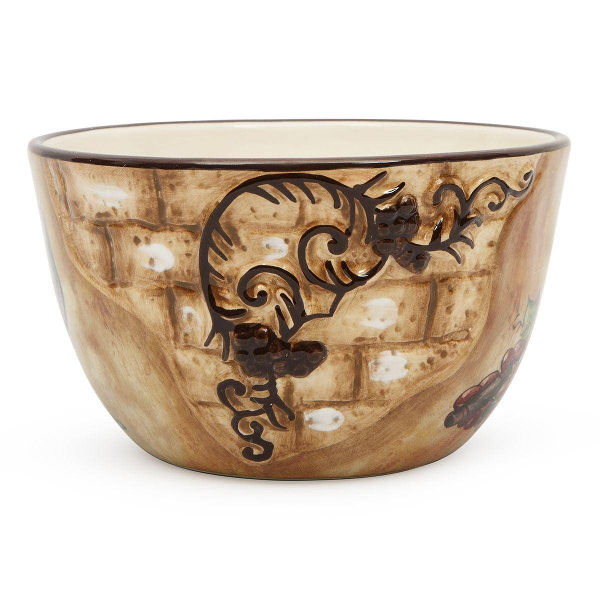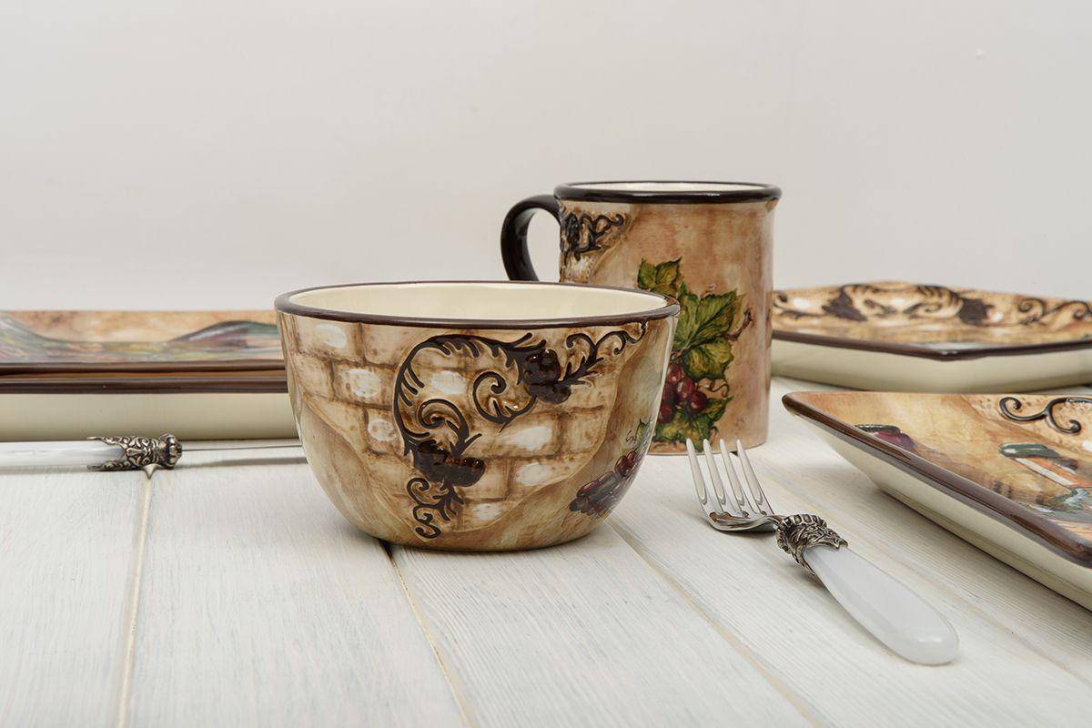 Пиалы из особо прочной керамики украшены выразительным рельефным декором, стилизованным под фрагменты каменной стены с частично осыпавшейся штукатуркой и витиеватыми гроздьями винограда. На гладких участках изделий нанесены изображения бокалов с напитком и кистей спелого винограда, которые хорошо различимы благодаря высокому качеству печати. Такой авторский дизайн был создан специально для Certified International художницами известной в США студии Tre Sorelle Studios.