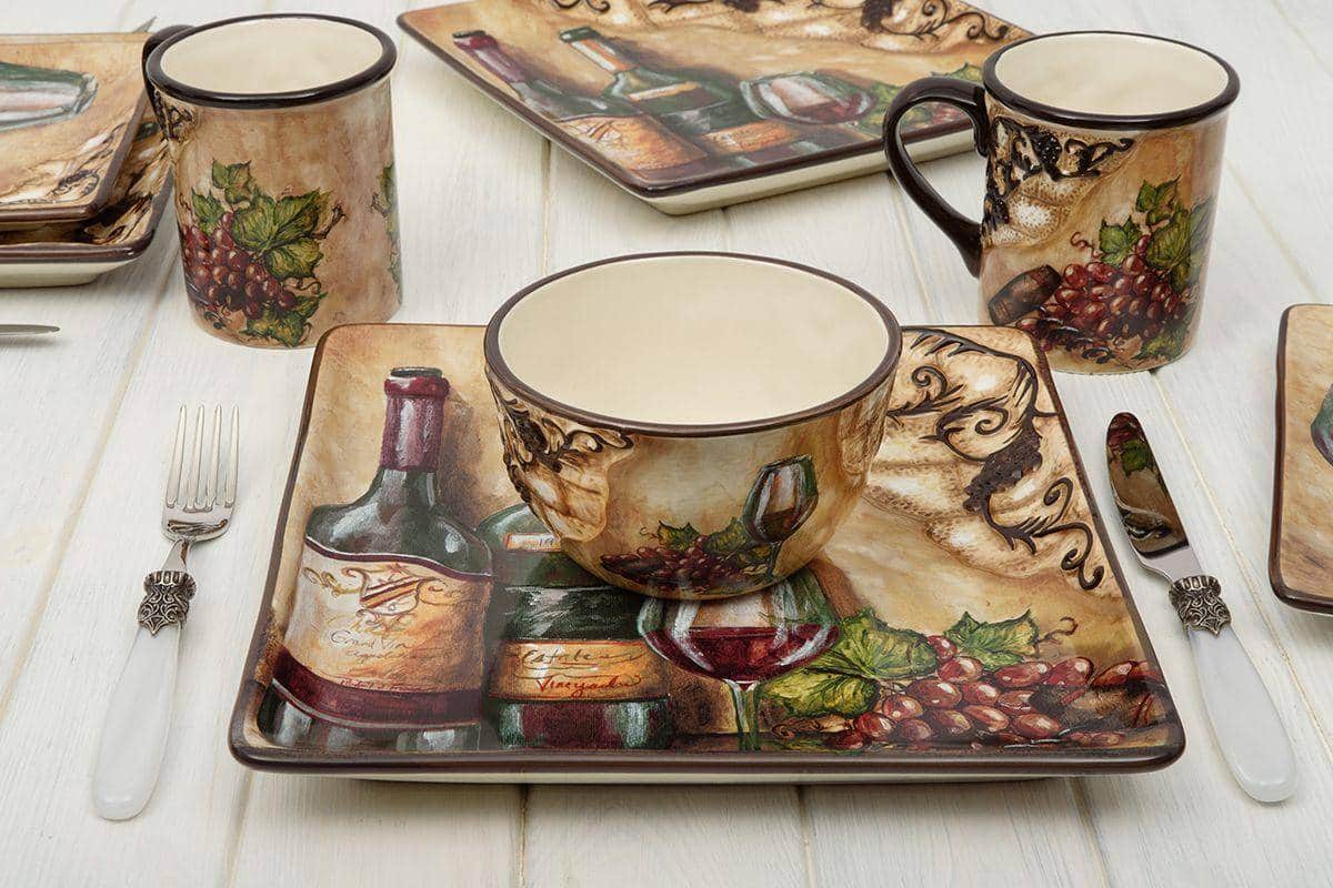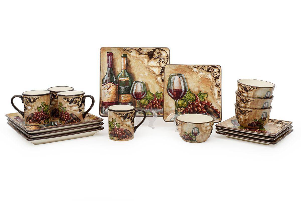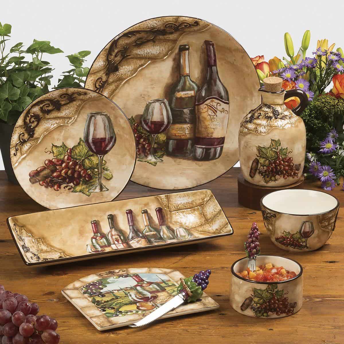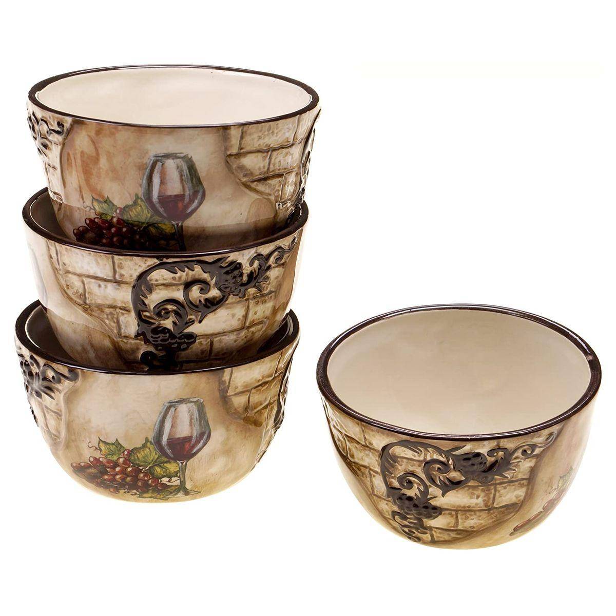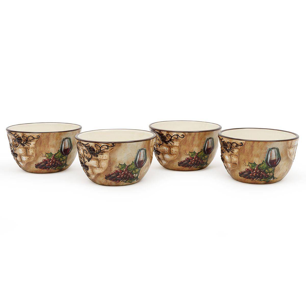 Пиалы из особо прочной керамики украшены выразительным рельефным декором, стилизованным под фрагменты каменной стены с частично осыпавшейся штукатуркой и витиеватыми гроздьями винограда. На гладких участках изделий нанесены изображения бокалов с напитком и кистей спелого винограда, которые хорошо различимы благодаря высокому качеству печати. Такой авторский дизайн был создан специально для Certified International художницами известной в США студии Tre Sorelle Studios.