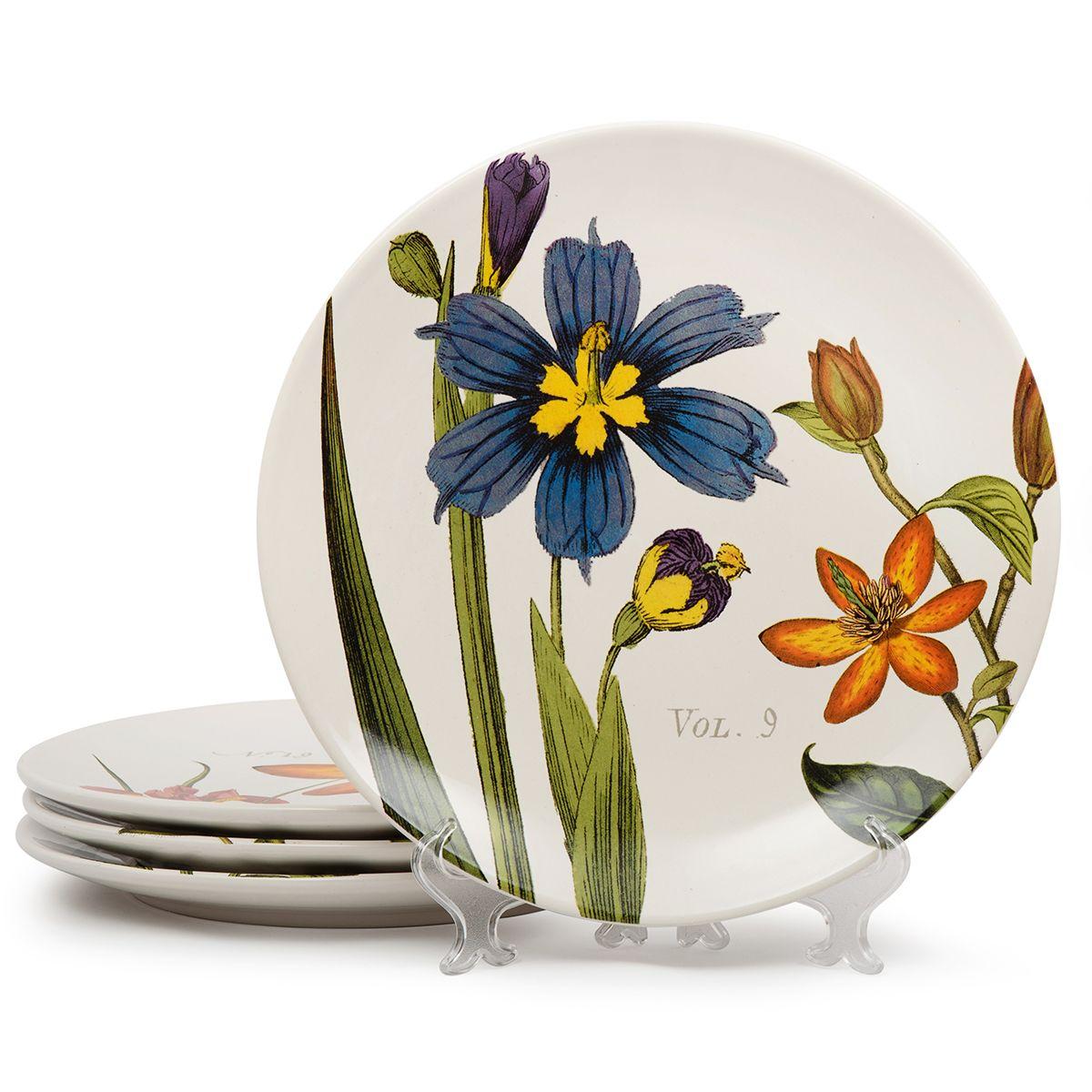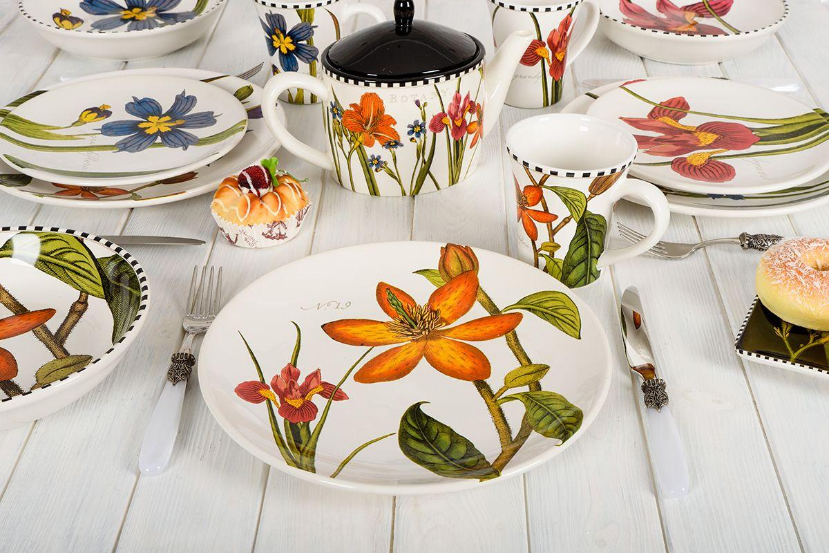 Каждая из четырех тарелок красивой ботанической коллекции «Рапсодия» украшена разным сюжетом: на идеальном белом фоне красуются ирисы, лилии и голубоглазки с тщательно прорисованными малейшими деталями и надписями на английском языке grandiflora, что значит «крупноцветковые». Дизайн яркого цветочного декора тарелок от Certified International разработан американской художницей Сью Шлабах, а сама коллекция выпущена ограниченным тиражом, что делает ее особенно ценной.