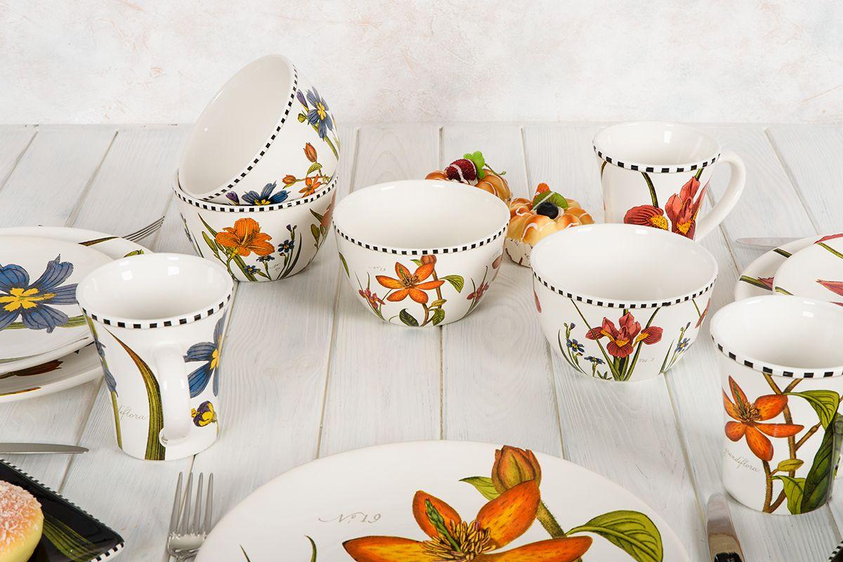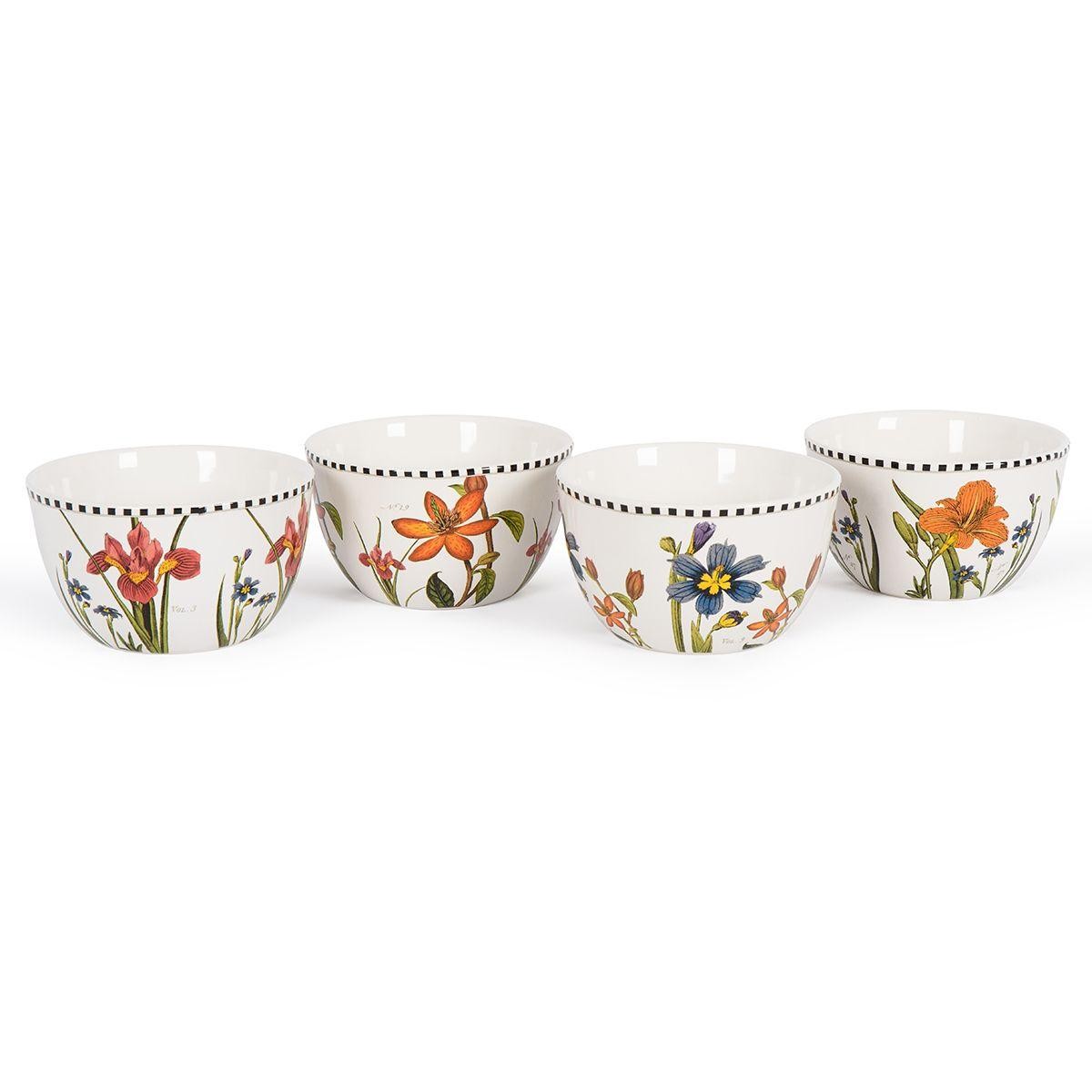 Изысканные пиалы с эффектным цветочным рисунком, похожим на красочные иллюстрации из книг по ботанике, представлены в четырех разных дизайнах, которые отлично комбинируются между собой, ведь их украшают знакомые с детства красивые садовые цветы: лилии, ирисы, голубоглазки. Нежность рисунка, разработанного американской художницей Сью Шлабах, подчеркивает элегантная кайма классической черно-белой расцветки.
