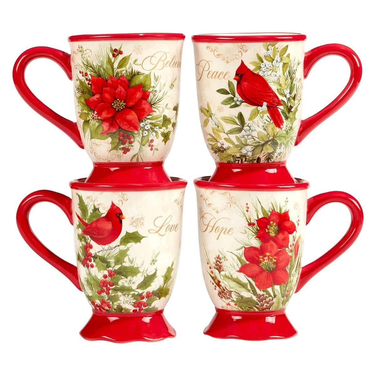 В комплект входят четыре большие чашки, каждая с собственным оформлением: две украшены разными вариациями пуансетии, а две — изображениями красных кардиналов. Сочетание торжественного красного с белым фоном, свежими зелёными оттенками и мягким золотым декором создаёт классическую рождественскую палитру.