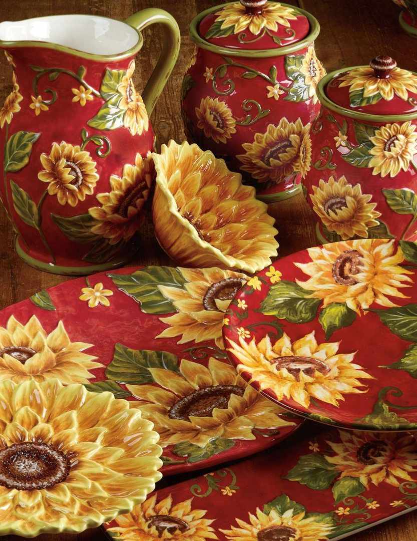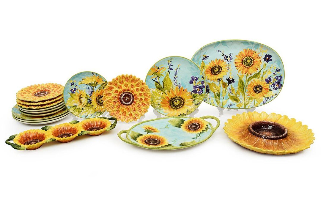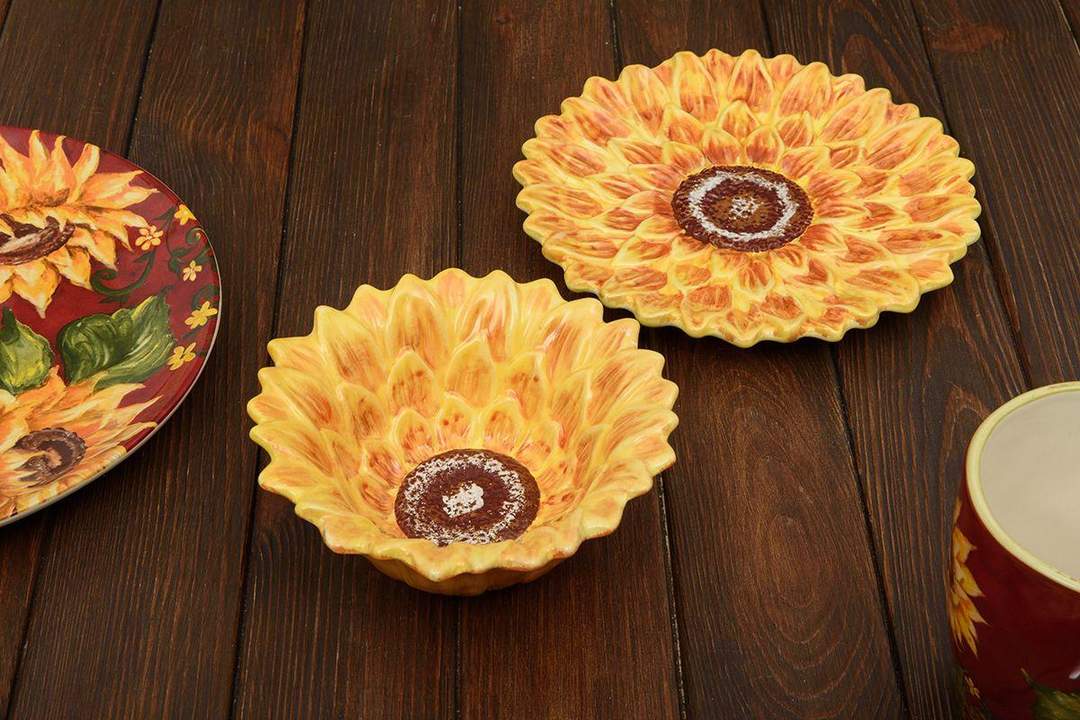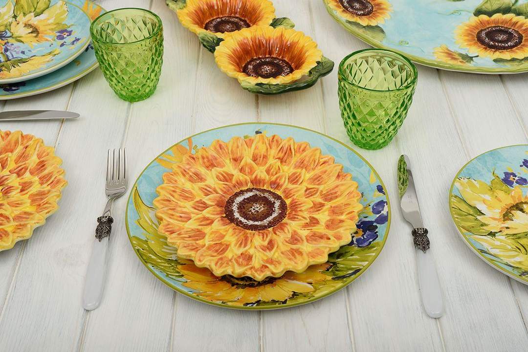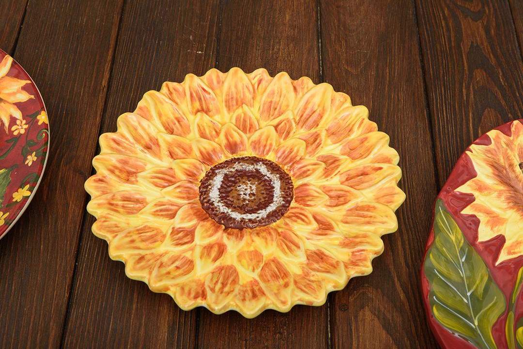 Глядя на оригинальные тарелки для десерта в виде объемных цветков подсолнуха, невольно задаешься вопросом, использовать их для украшения дизайна или подавать на них угощения. Над неповторимым дизайном тарелок трудилась известная американская художница Сьюзан Уингент для компании Certified International. Посуда прекрасно подойдет для подачи различных салатов, десертов, порезанных фруктов. Как изысканный вариант – на тарелках можно установить зажженные свечи. Посуда выполнена из прочной экологичной керамики и раскрашена вручную. На поверхность тарелок нанесена стойкая глянцевая глазурь, которая придает неповторимый блеск и защищает от возникновения царапин и потертостей. Для эффектной сервировки тарелки рекомендуется комбинировать с другой посудой коллекции, а также стаканами, имеющими рельефный узор Skyline от Maison.