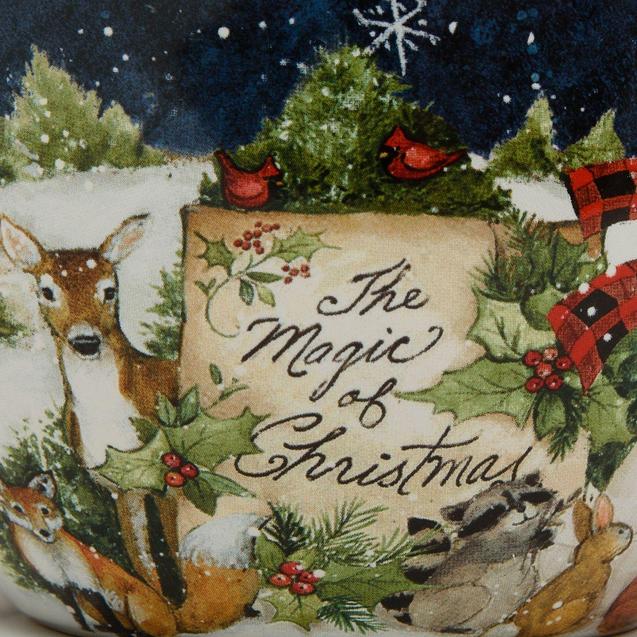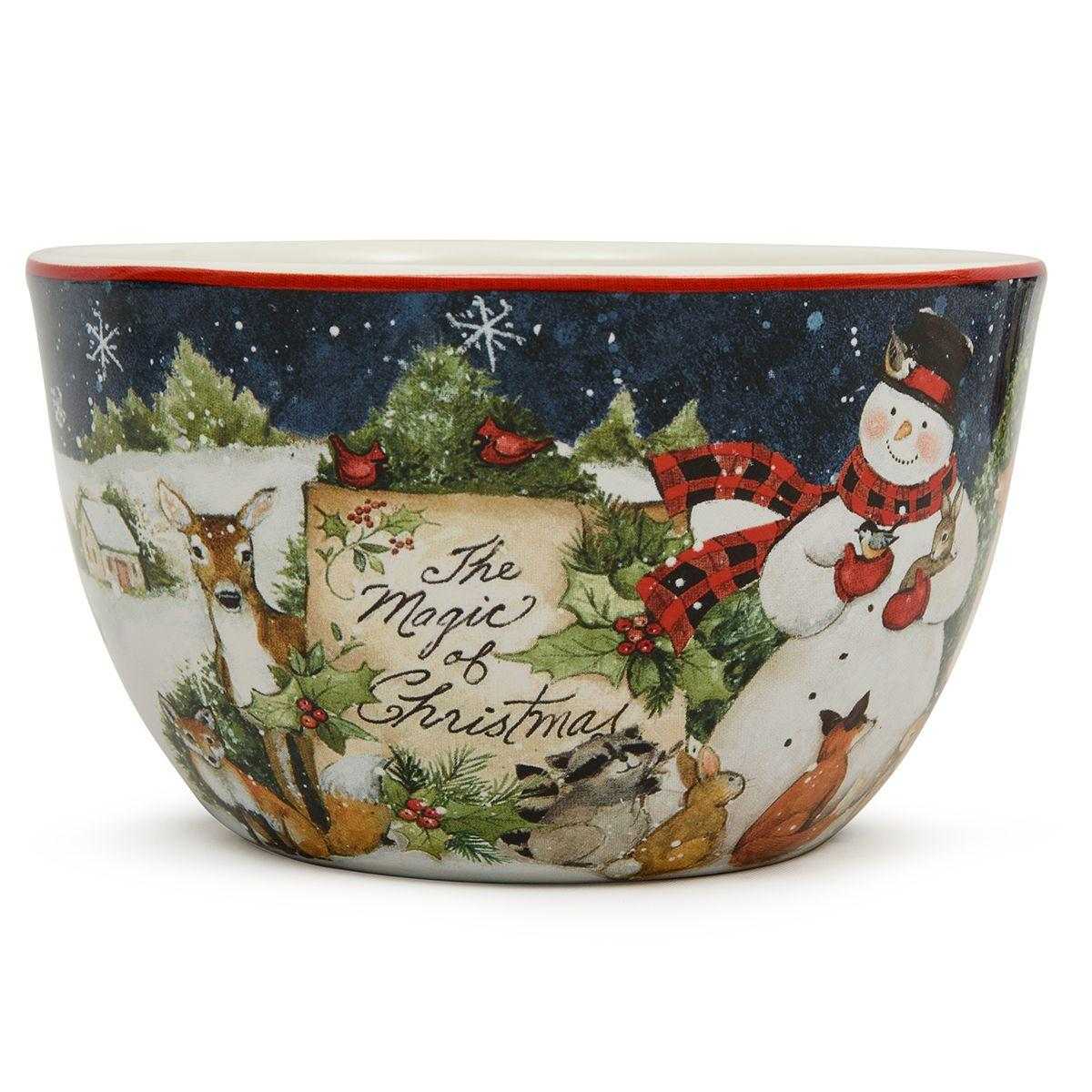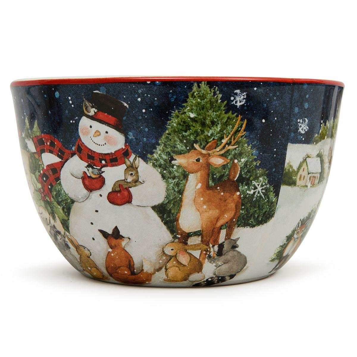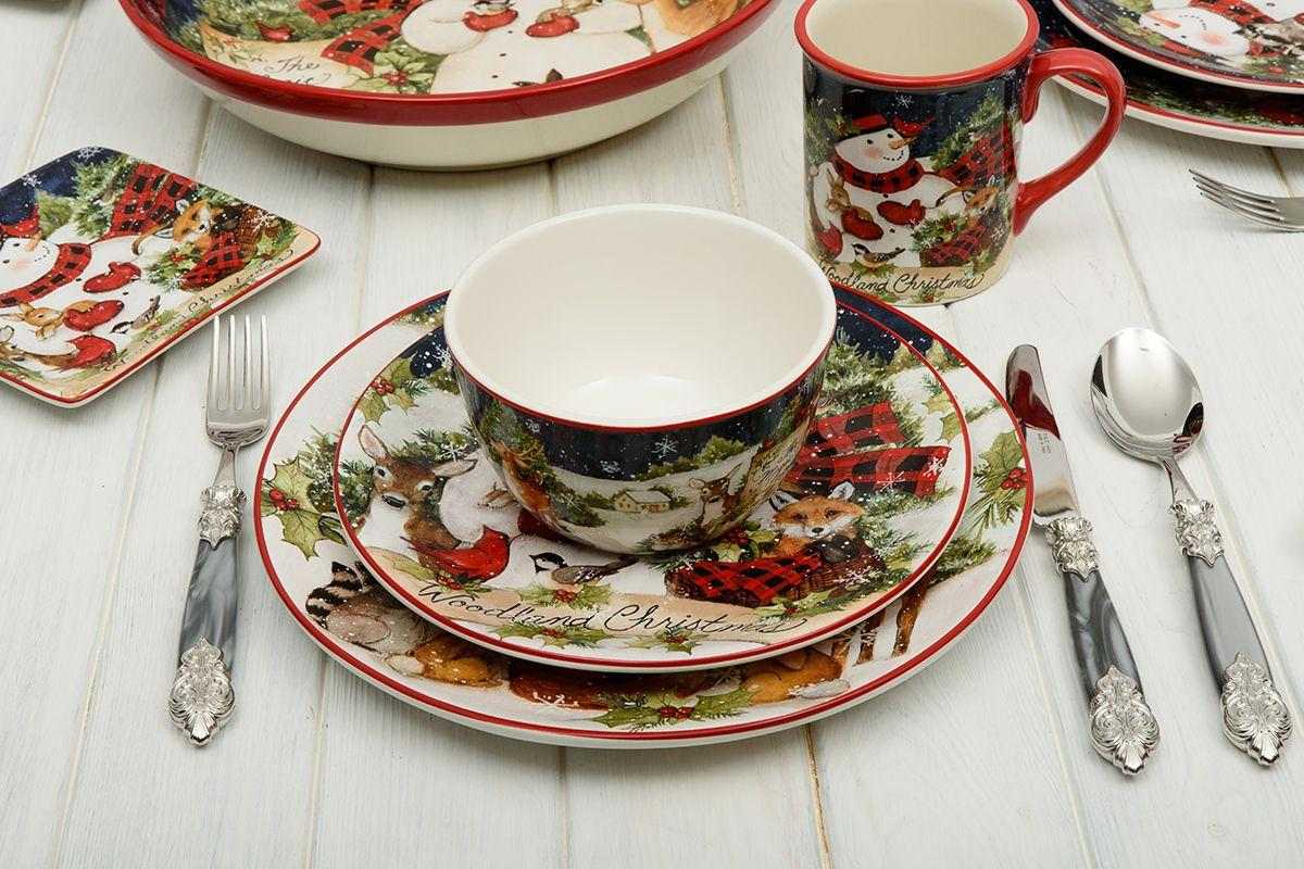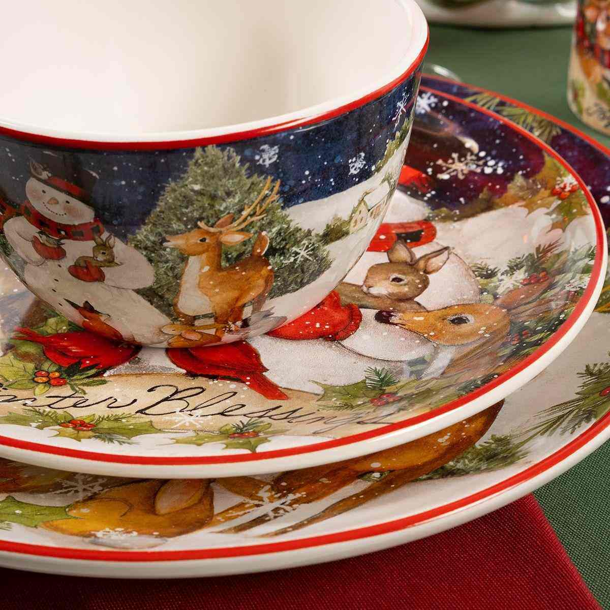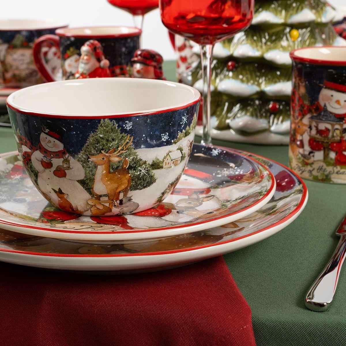 Контраст ночного неба и белого снега стал фоном для трогательной сцены, где снеговик и лесные зверьки передают рождественские поздравления. В коллекции новогоднего декора также есть бисквитные фигурки-снеговики, идеально сочетающиеся с этой посудой.