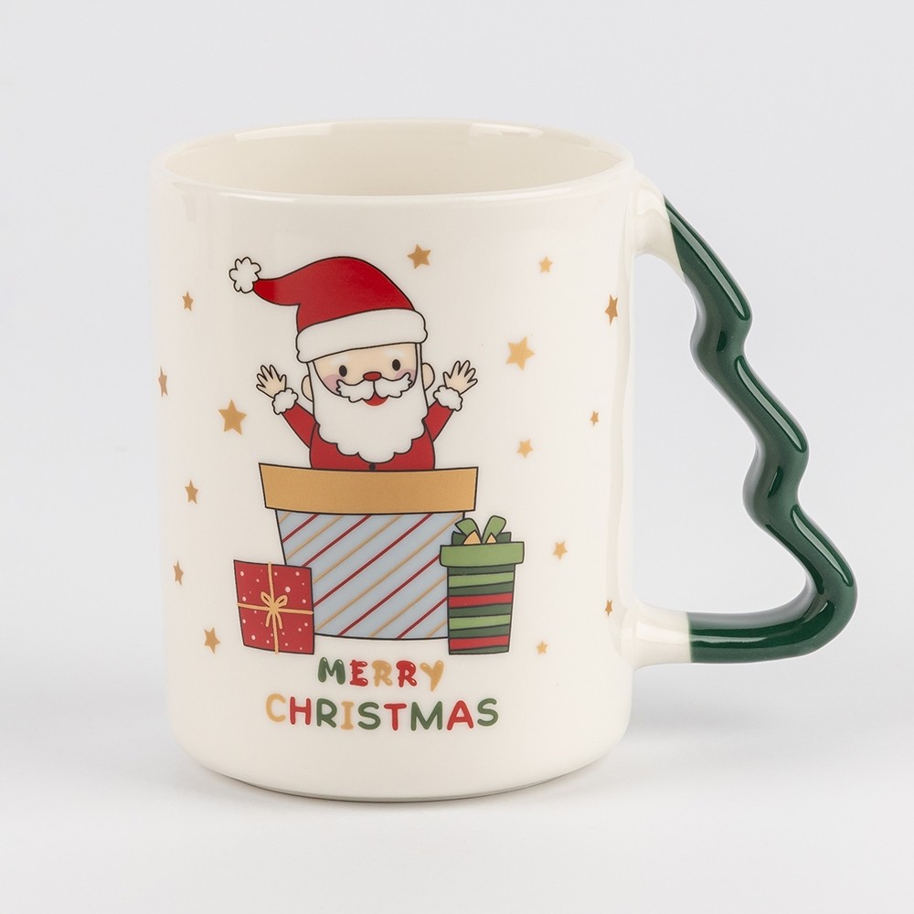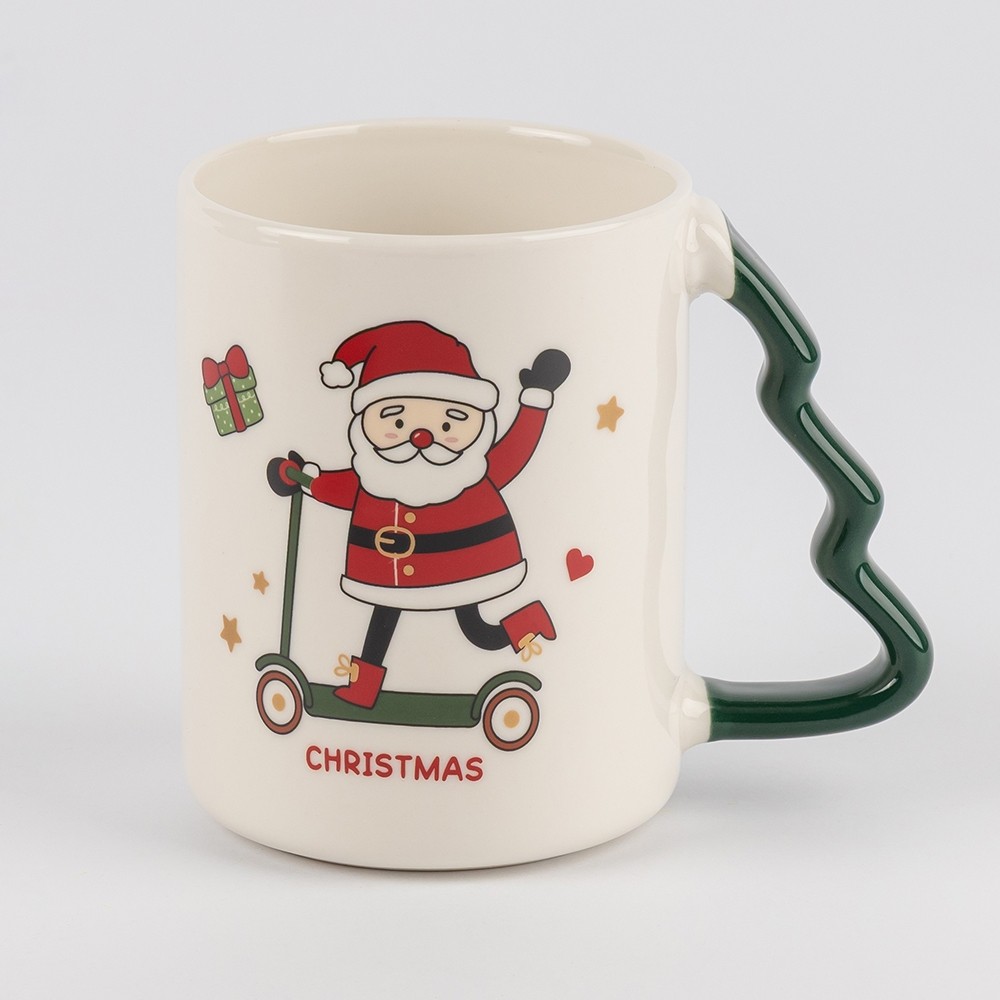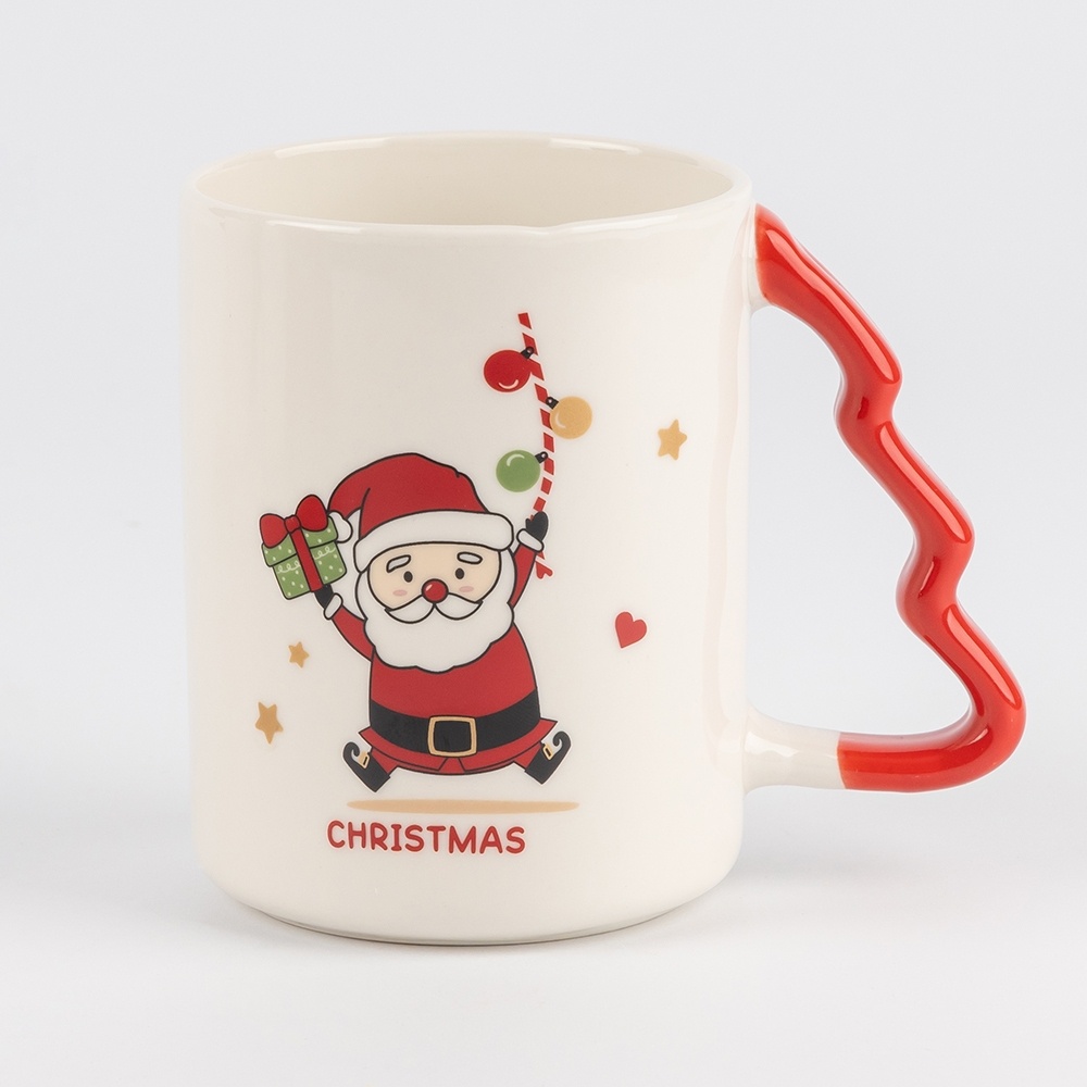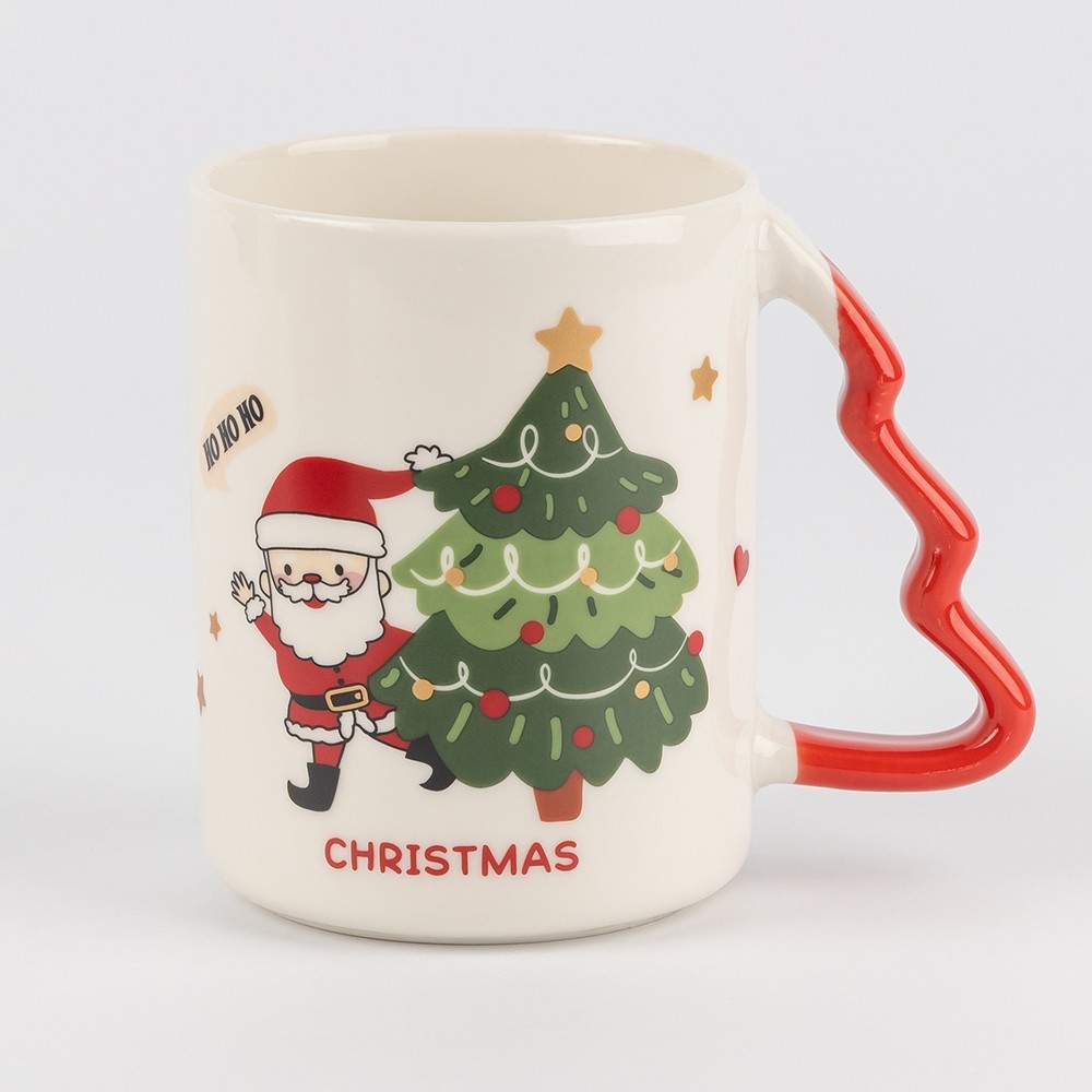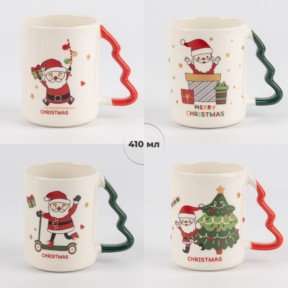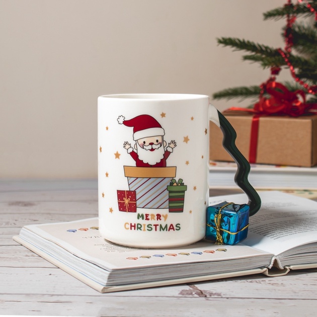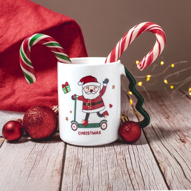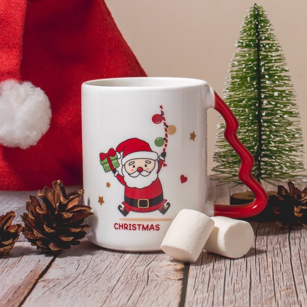 Фигурные ручки в форме ёлочки, окрашенные в красный и зелёный, создают ещё более нарядный вид. Диаметр чашки — 8 см, высота — 11 см, поэтому она удобно лежит в руке, а напитка хватает, чтобы насладиться долгим уютным вечером.