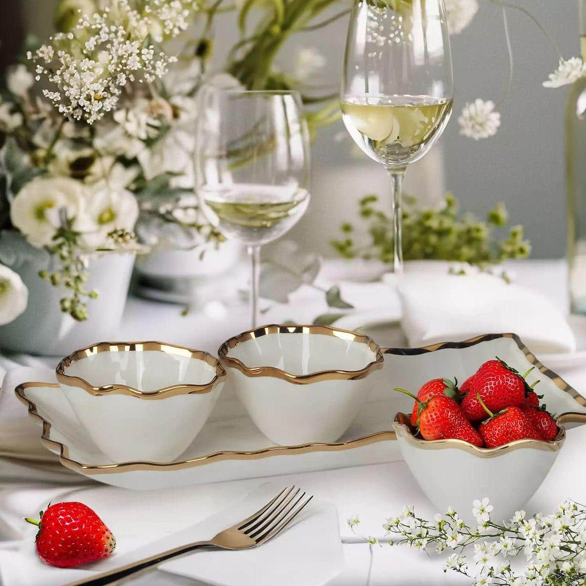 Набор из блюда и трёх пиал Regency Gold создан для тех, кто любит красивую и продуманную сервировку. Белоснежная керамика с волнистым золотым краем смотрится по-настоящему элегантно и подчёркивает любую подачу — от соусов и закусок до орешков и ягод. Удобное продолговатое блюдо размером 35,5×16×6 см аккуратно удерживает три изящные пиалы, делая композицию цельной и стильной. Каждая пиала высотой 6 см и диаметром 11 см идеально подходит для небольших порций, создавая аккуратный и эстетичный вид. Такой набор станет прекрасным акцентом на праздничном столе и незаменимым помощником для ежедневных трапез. Он добавляет атмосферу уюта, гармонии и лёгкой роскоши в каждый момент.