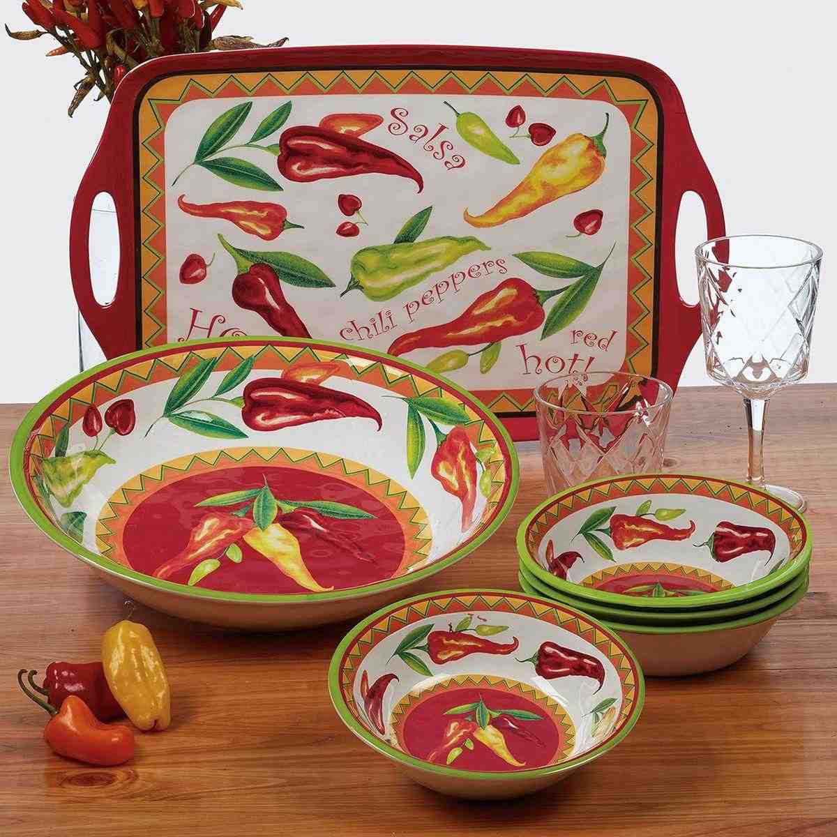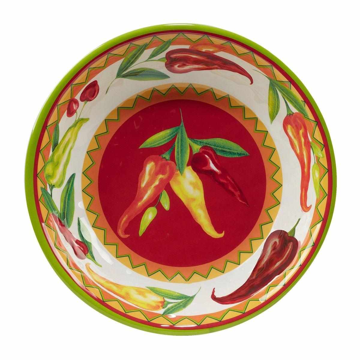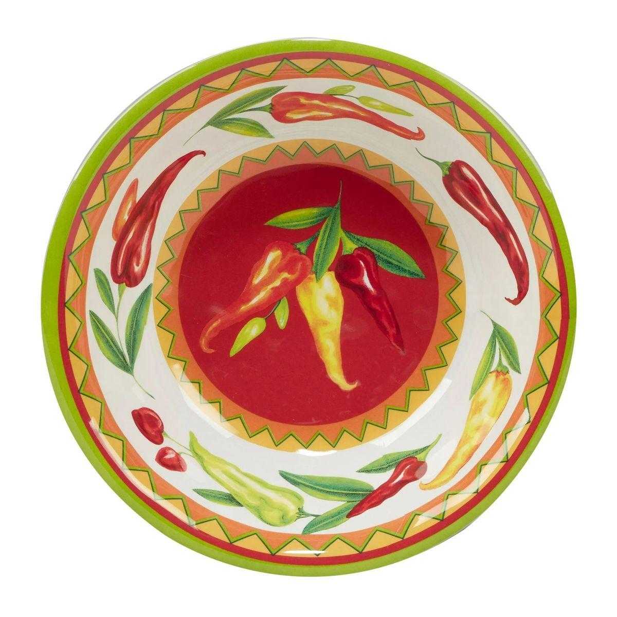 Этот набор «Горячий чили» от Certified International состоит из одного большого глубокого блюда диаметром 35 см и четырёх пиал диаметром 19 см. Посуда украшена сочным рисунком красного и жёлтого перца, создающим эффектную и красочную сервировку. Изделия изготовлены из прочного и безопасного меламина, который не содержит бисфенола, что подтверждено сертификатами безопасности. Набор можно мыть в посудомоечной машине при температуре не выше +70°. Запрещено использовать эти предметы в духовке или микроволновой печи, а также чистить их абразивными средствами. Бренд зарегистрирован в США, а производство осуществляется на заводах Certified International в КНР.