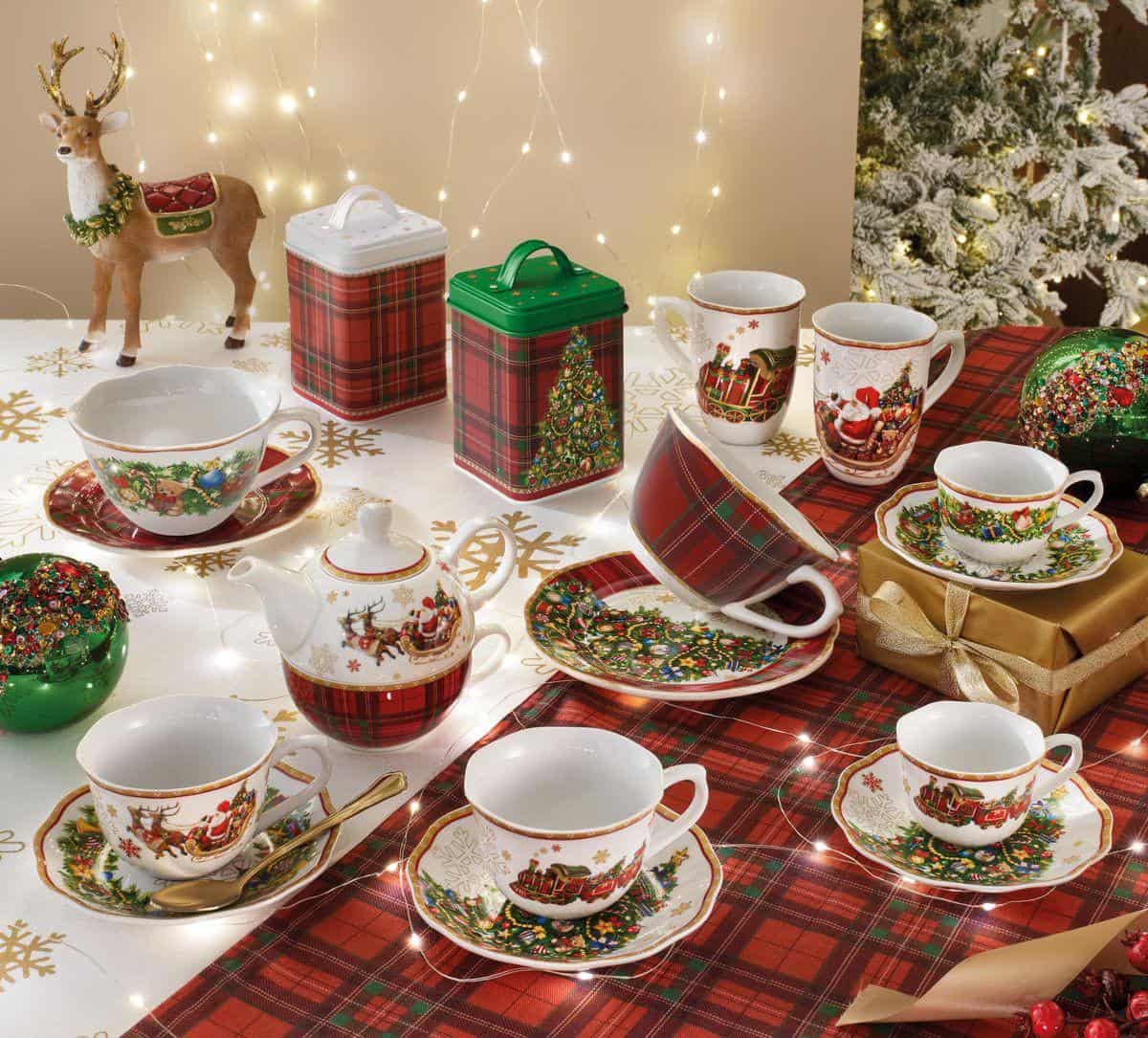 Набор кофейных чашек Christmas Brandani выделяется праздничным рисунком, где на фоне зелёных еловых веток размещены игрушки, сладости и миниатюрный рождественский поезд. Каждая чашка удобно ложится в руку, а её компактная форма идеально подходит для крепкого ароматного кофе. Блюдца с плавными очертаниями и яркими оттенками подчеркивают дизайн чашек и делают сервировку более выразительной. Фарфор отличается плотной гладкой поверхностью и сохраняет тепло напитка достаточно долго. Детальная печать выполнена аккуратно, поэтому цвета остаются яркими даже при частом использовании. Такой набор легко создаёт праздничное настроение и делает каждую кофейную паузу более атмосферной.