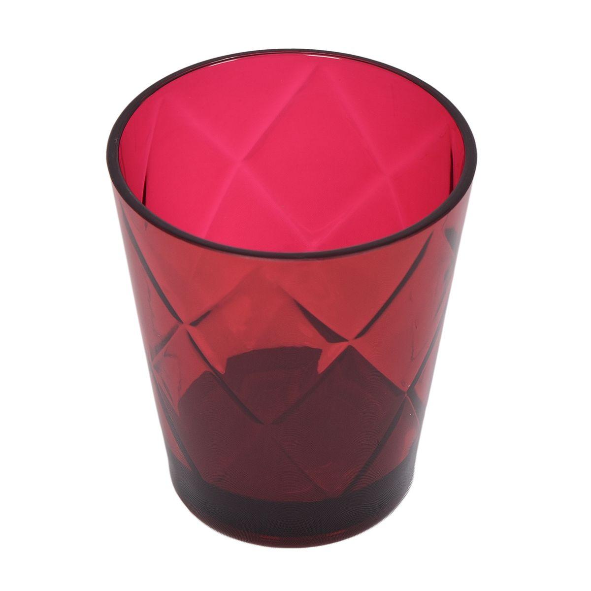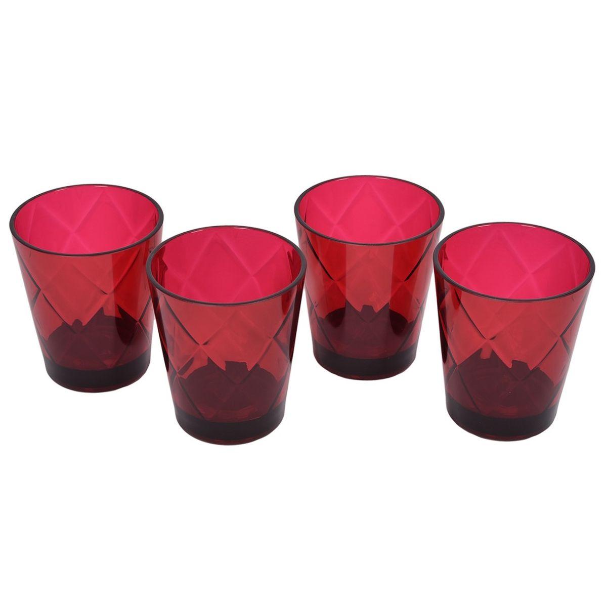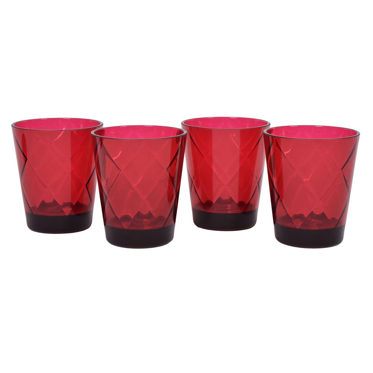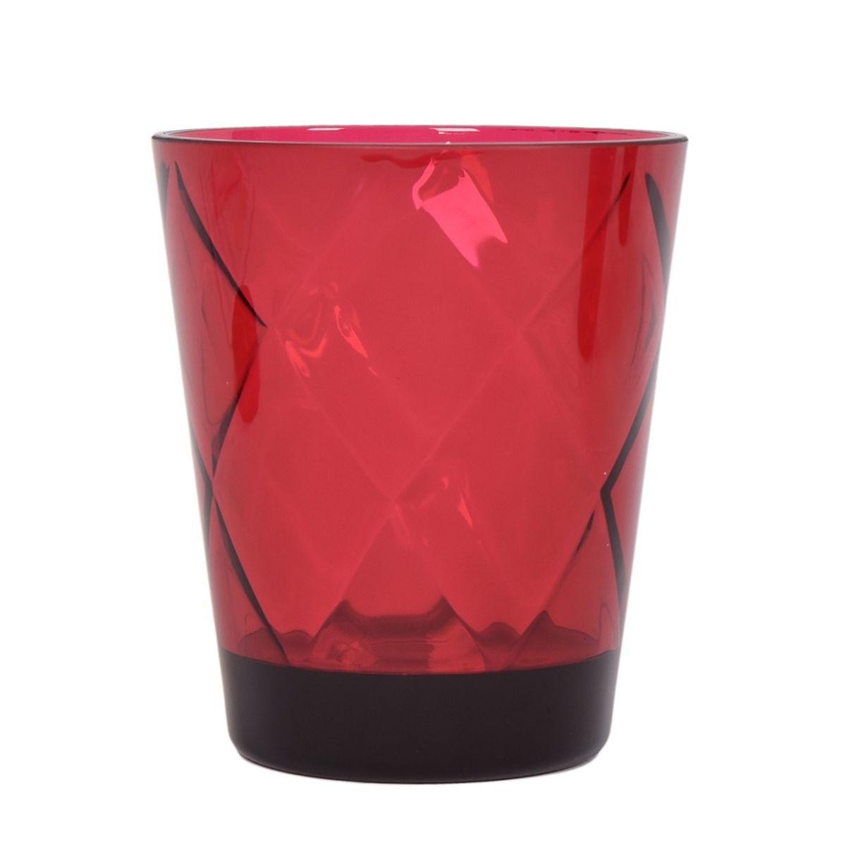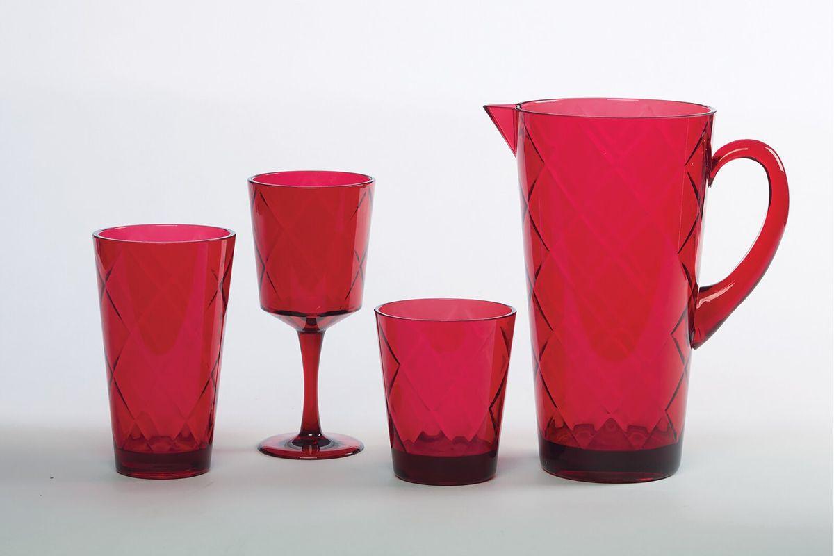 Набір із чотирьох високих акрилових склянок червоного кольору відмінно впишуться і додадуть яскравих фарб у сервірування столу. Акриловий посуд користується зараз неймовірною популярністю. Нею сервірують столи не тільки на пікніках і банкетах просто неба, а й на домашніх урочистостях і дитячих святах. Така популярність має пояснення. Вироби з акрилу не тільки красиві та за своїм зовнішнім виглядом є копією скляних склянок, але ще безпечні у використанні, міцні, легкі та щільні. Їх приємно тримати в руці та насолоджуватися смаком напою. Призначений акриловий посуд тільки для холодних напоїв, гарячі не можна наливати. Склянки можна вдало доповнити глечиком із червоного акрилу з таким же ромбоподібним малюнком на всій поверхні.