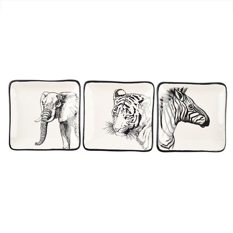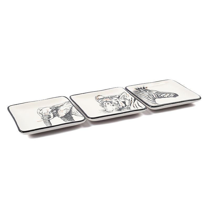 Три квадратні пластини з різним малюнком. Щільна кераміка ручного формування, поверхня трохи нерівна, стилізована під гончарне ліплення. Принтовий малюнок захищений термостійкою глазур'ю. Тарілки можна нагрівати в мікрохвильовій печі.