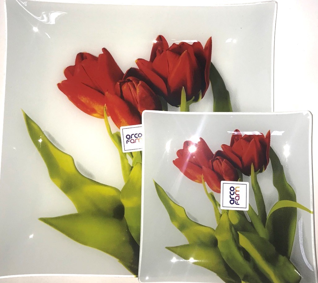 Набір із 6 скляних тарілок діаметром 20 см та 1 страва для торта 30 см із квітковим візерунком стане чудовим подарунком будь-якій жінці та мамі: на професійне свято, на ювілей.