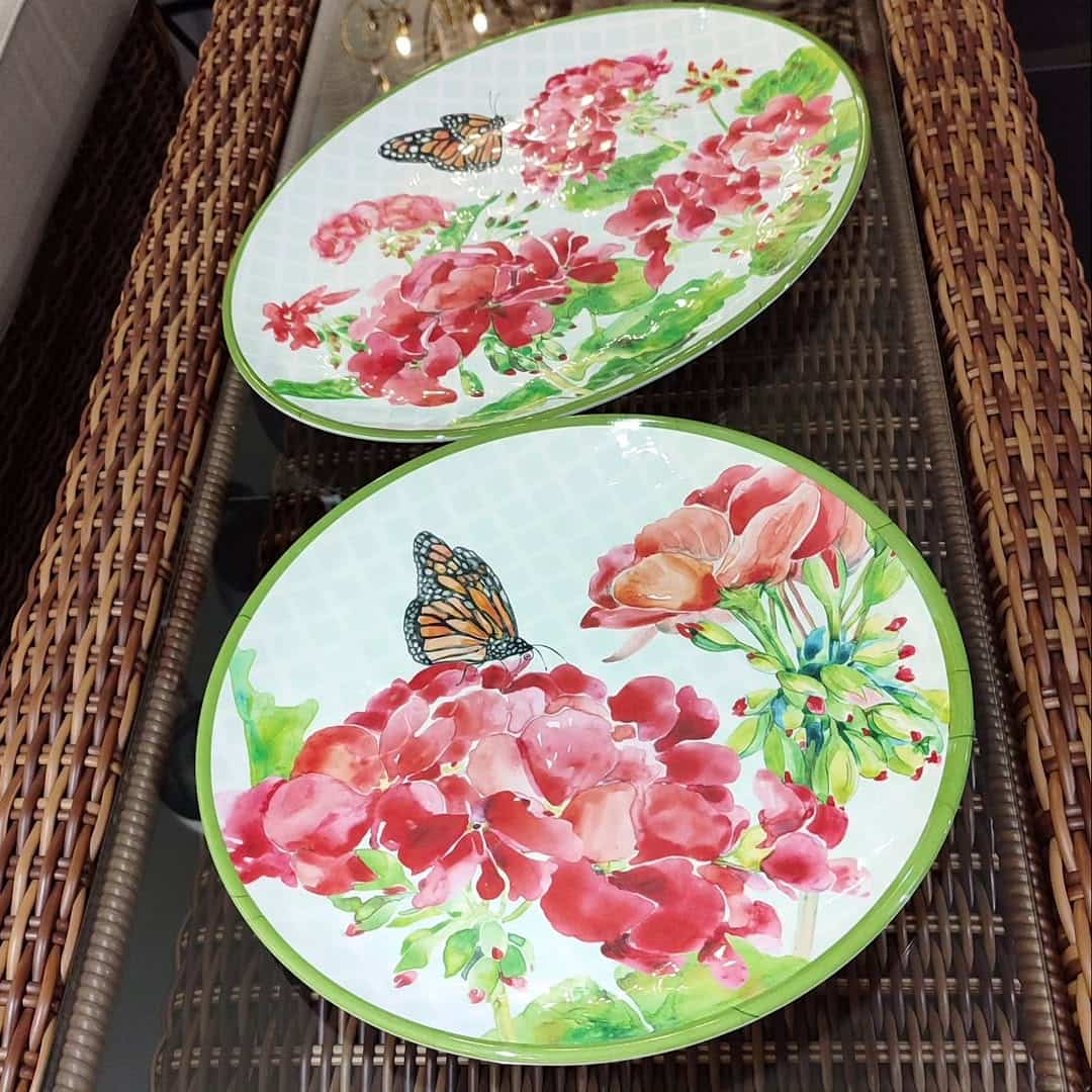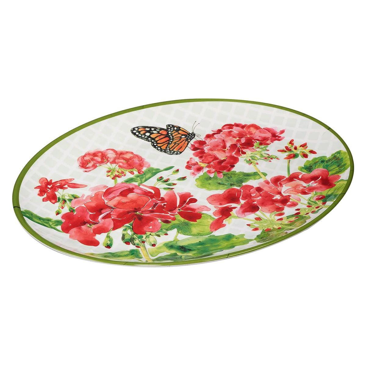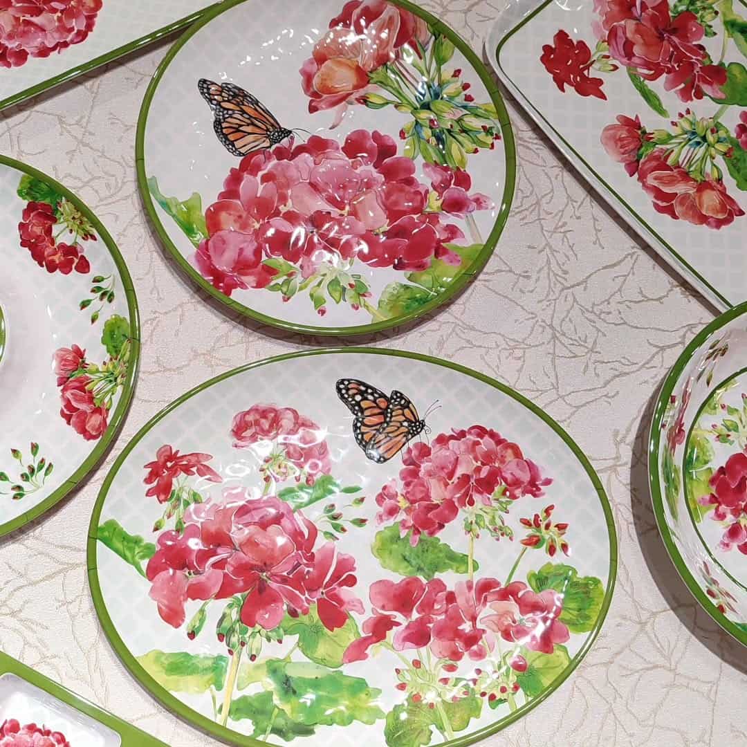 Посуда, которая всегда станет ярким акцентом сервировки. Пышные соцветия красной герани в любое время года наполняют стол цветочными мотивами, а изящные бабочки подчёркивают естественность рисунка — словно трапеза проходит в летнем саду. При этом меламиновые блюда действительно удобно использовать на природе: они не бьются и легко моются.