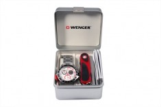 Подарунковий набір Wenger складається з наручного годинника Wenger Battalion Chrono Sport, армійського ножа Wenge Evogrip та футляра з легкого металу сріблястого кольору для зберігання наручного годинника.