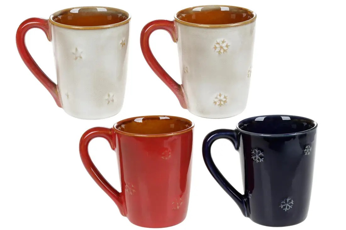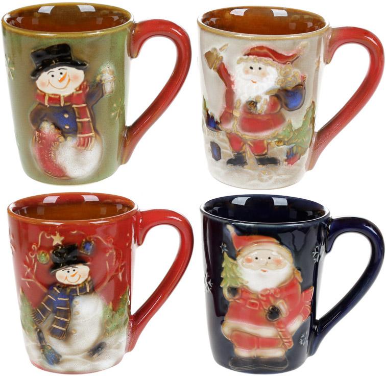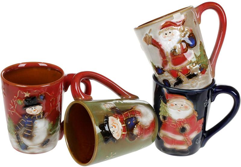 Святковий кухоль з високими товстими керамічними стінками в теплих кольорах. На вибір - бежевий, червоно-коричневий (червоно-коричневий усередині) або синій. Рельєфний малюнок новорічних героїв – Олень, Сніговик чи Дід Мороз.