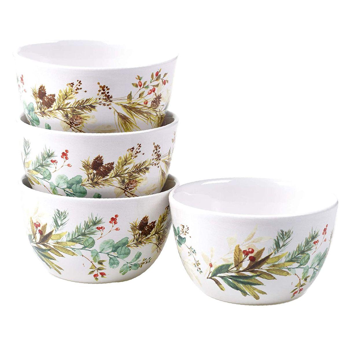 Керамические пиалы из коллекции «Рождественская сказка» украшает нежный узор в виде изящных переплетений вечнозеленых растений, ягод и еловых ветвей с шишками, образующих красивые венки.