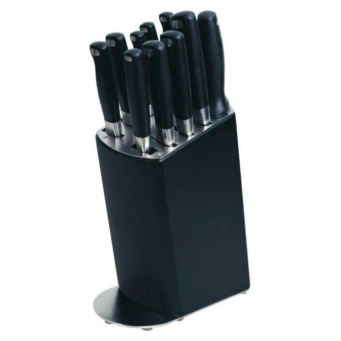 Из кованой, закаленной льдом хром-молибден-ванадиевой нержавеющей стали X50CrMoV15, лезвия ножей заточены вручную и долго сохраняют режущие свойства, эргономичные ручки обеспечивают безопасность и удобство работы, легко затачиваются, колода из дерева