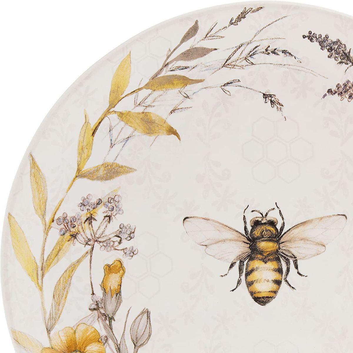 Белые обеденные тарелки из крепкой керамики украшает едва заметный узор, который является фоном для основного рисунка – милой пчелкой, окруженной венком из желтых цветов и растений, словно нарисованных простым карандашом.
