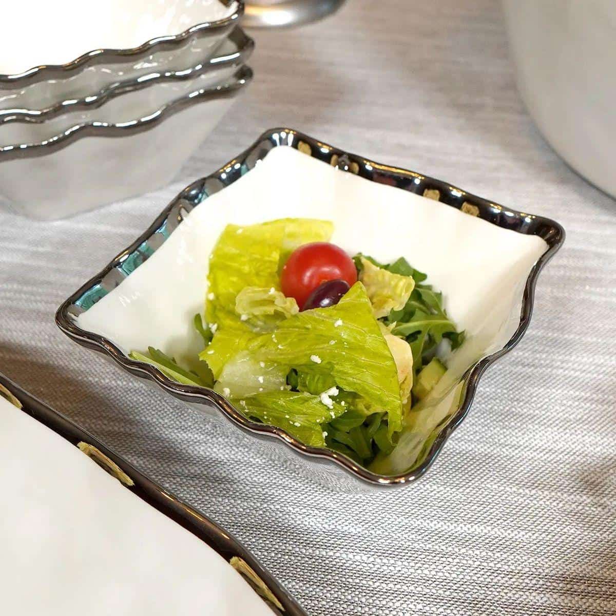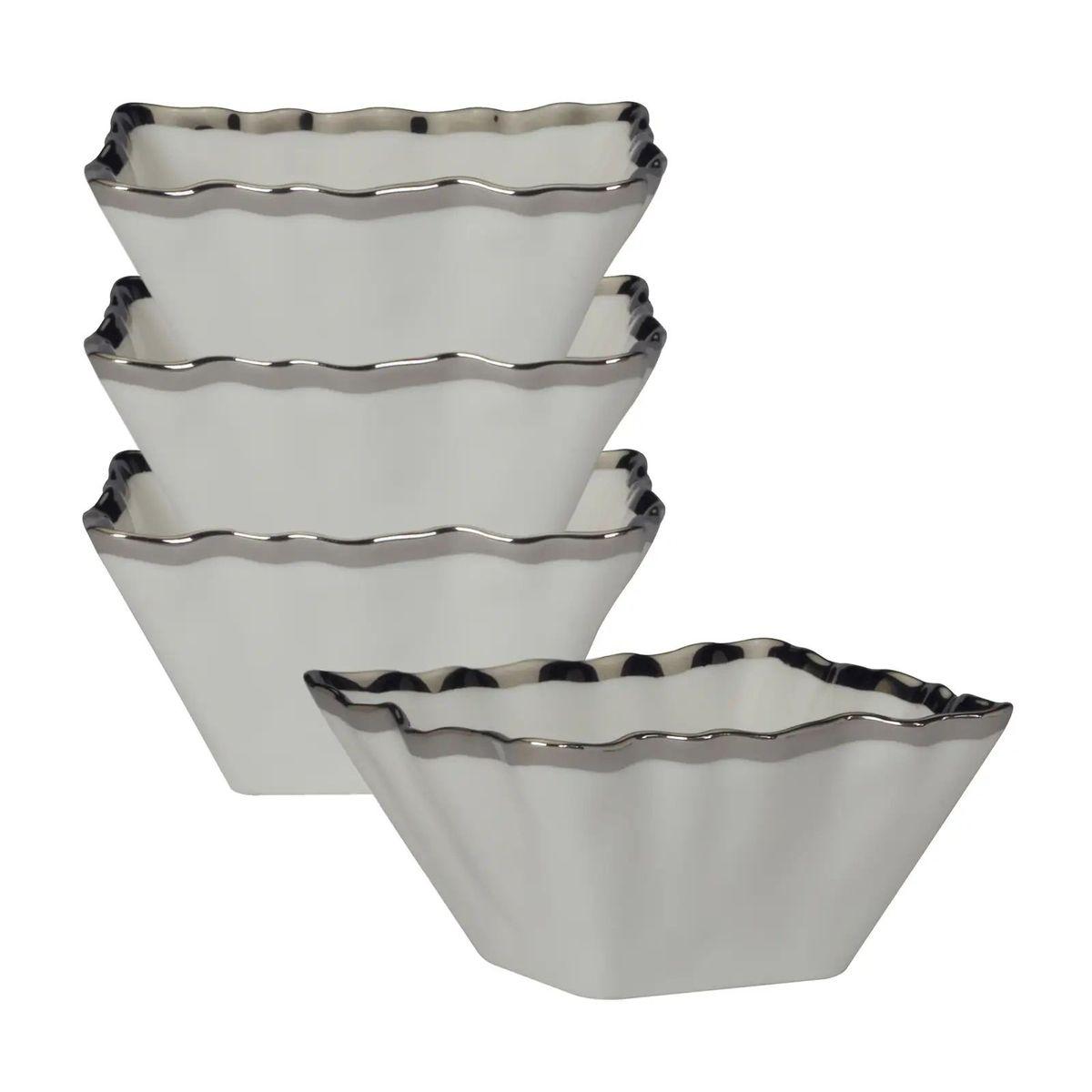 Набор из четырёх пиал Regency Gold – это идеальное сочетание лаконичного белого цвета и роскошного серебряного контура. Благодаря квадратной форме и волнистому краю каждая пиала выглядит как дизайнерский элемент сервировки. Они подходят для подачи закусок, салатов, ягод, орехов или соусов, мгновенно украшая любой стол. Прочная износостойкая глазурь сохраняет идеальный вид даже при ежедневном использовании. Пиалы можно мыть в посудомоечной машине, что делает их удобными для современной кухни. Такой набор станет элегантным подарком и гармонично дополнит коллекцию посуды Regency Silver.