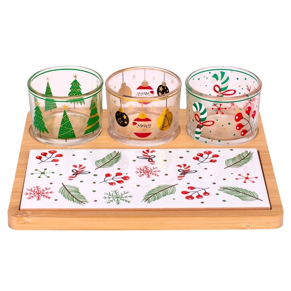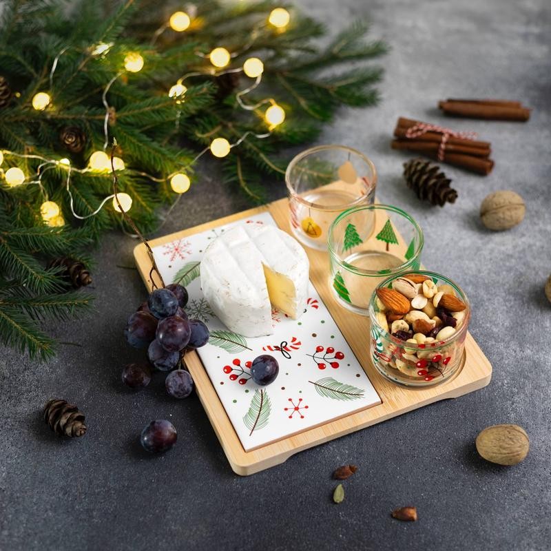 Набор пиал с доской на бамбуковой подставке Bamboo Joy 22×19,5 см — это настоящий праздник для вашего стола. Три вместительные пиалы выполнены из прочного стекла и украшены новогодними рисунками: зелёные ёлочки, нарядные шары, ягоды и снежинки создают ощущение зимней сказки. Бамбуковая подставка с керамической плиткой украшена нежным зимним орнаментом, который добавляет сервировке стиль и уют, а также защищает поверхность стола.