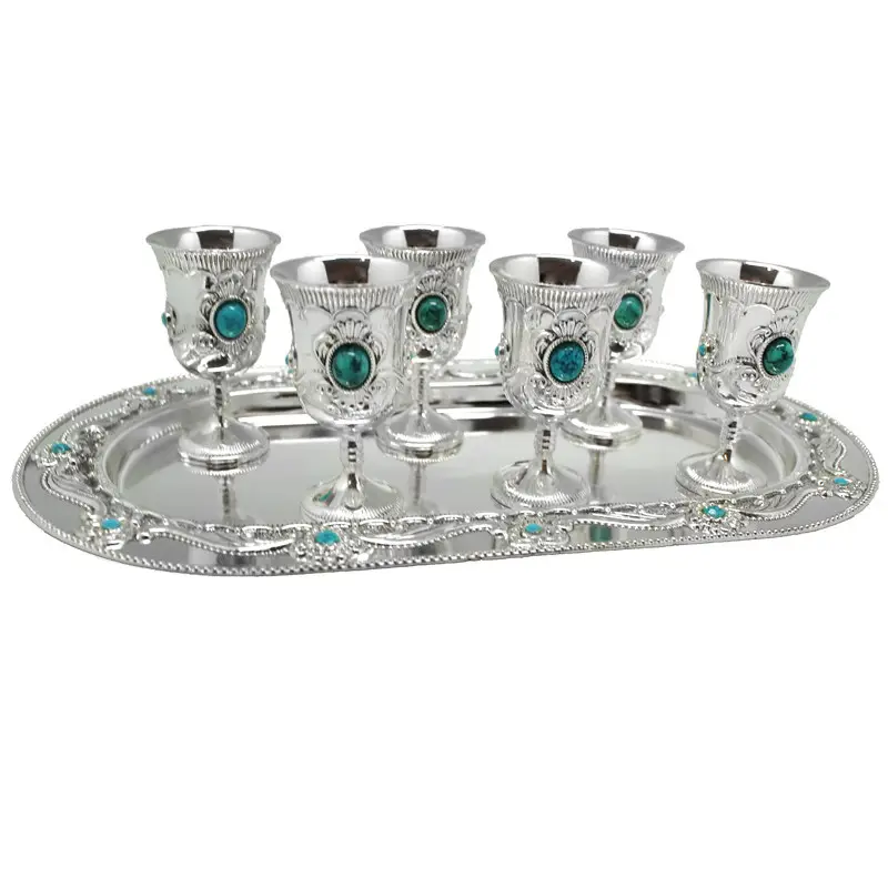 Окунитесь в мир изысканности и королевского стиля с этим роскошным набором бокалов на подносе. Каждый элемент создан с вниманием к мельчайшим деталям: изысканная гравировка, благородный блеск металла и утончённые бирюзовые вставки придают бокалам поистине царственный вид. Такой набор не просто украшение стола — это воплощение утончённого вкуса и уважения к традициям.