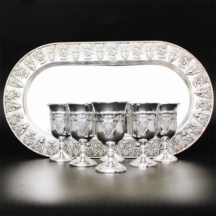 Вишуканий набір для спиртних напоїв із якісного металу з посрібленням. Всі елементи набору прикрашені елегантними візерунками, кожна чарка має тонку ніжку, яка дозволяє зручно тримати її і насолоджуватися напоєм.