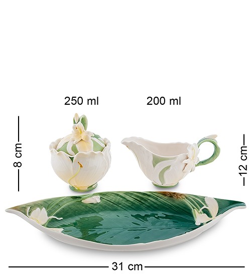 При погляді на такий витвір мистецтва хочеться милуватися дизайном порцелянового виробу і ніжно використовувати його у своїх цілях. Особливу увагу привертає і молочник, яскраво-білого відтінку, красивої форми з незвичайними зеленими лініями збоку. Гарний набір стане чудовим доповненням колекції високоякісної порцеляни для особливих моментів у житті. Порцеляновий посуд завжди привертає до себе підвищену увагу, адже в кожній лінії закладена душа творця набору та ніжність лілій.
