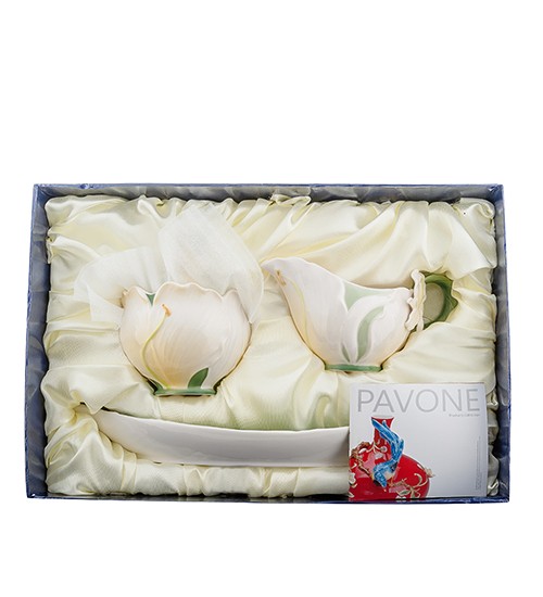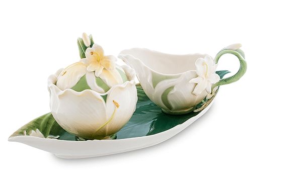 Сонячний набір цукорниця та молочник «Лілія» немов пливуть на зеленій страві, створеній у вигляді великого листка, що нагадує гондолу. М'які форми цукорниці покриті пелюстками лілії з усіх боків, а кришечка прикрашена опуклою квіткою з жовтою серединкою.