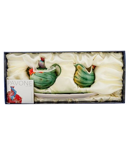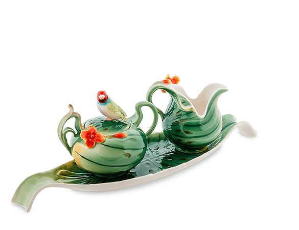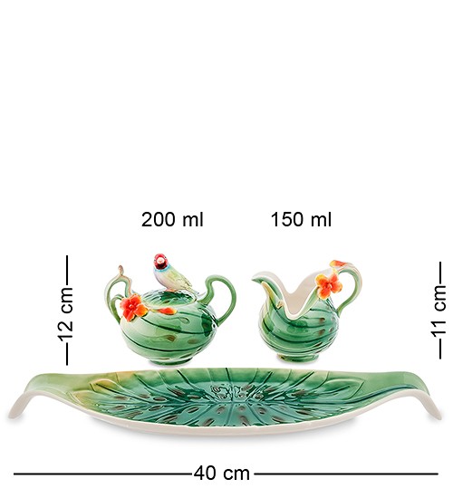 Плавні лінії від основи цукорниці та молочника вдало переплітаються з виразністю та реалістичністю папуги, що розташувалася нагорі. Своєю присутністю він буде спрямовувати ваші думки в позитивне русло і створюватиме сприятливу обстановку в кімнаті, роблячи її ще світлішою і затишнішою.
