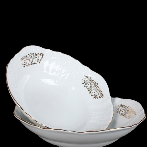 Чуть более крупные — 19 и 23 см — подойдут для подачи одного-двух салатов или гарниров. Они уместны и на повседневном семейном ужине, и на праздничной сервировке. Их форма подчёркивает декоративность, а золотая кайма ловит свет и добавляет сервировке глубины.