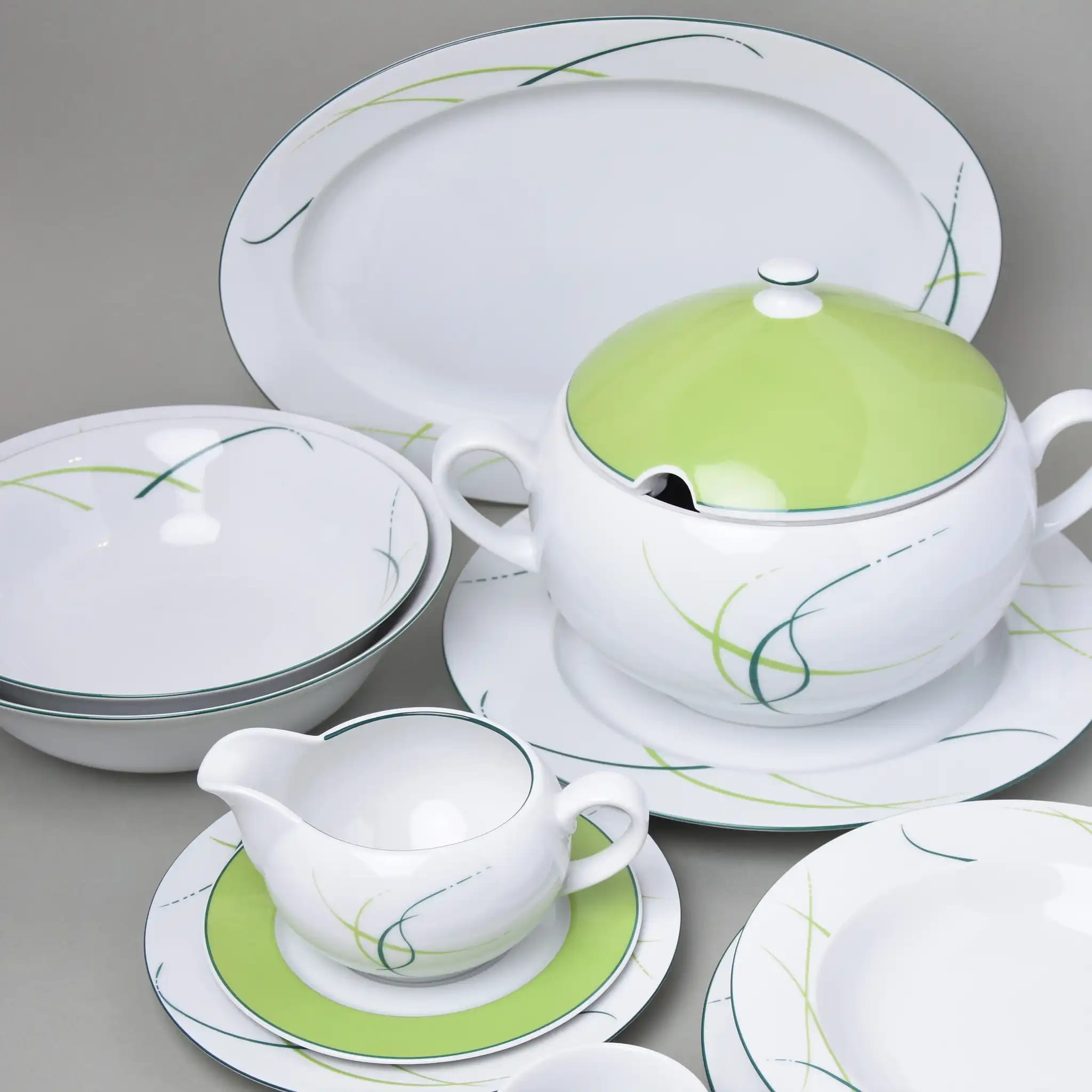 Салатники Thun Opal "Трава" диаметром 13, 16 и 19 см — это набор фарфоровых мисок, в которых каждая форма выполняет свою чёткую задачу. Белый чешский фарфор с мягким абстрактным узором в зелёных и серых линиях впишется в любую сервировку: от повседневной кухни до праздничного ужина. Такой комплект — настоящая находка для тех, кто ценит эстетику, практичность и порядок на столе.