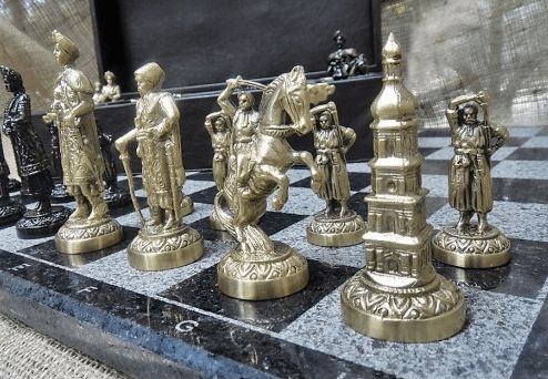 Шахматы – это не просто игра, это всегда сражение. Эти шахматы – шедевр ювелирного искусства. Фигурки – это миниатюры героев украинского козацтва,выполненные из бронзы методом литья,покрытые лаком . Любая партия, сыгранная в эти шахматы, запомнится на всю жизнь.Шахматная доска выполнены из мрамора черного,и серого цвета .