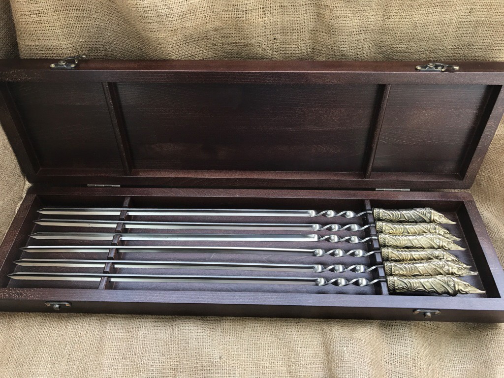 Шампура Щука з рукояттю з бронзи, виконані методом вакуумного лиття, вкриті теплостійким лаком, шампур виготовлений з харчової нержавіючої сталі, товщина металу шампура 10х3мм.