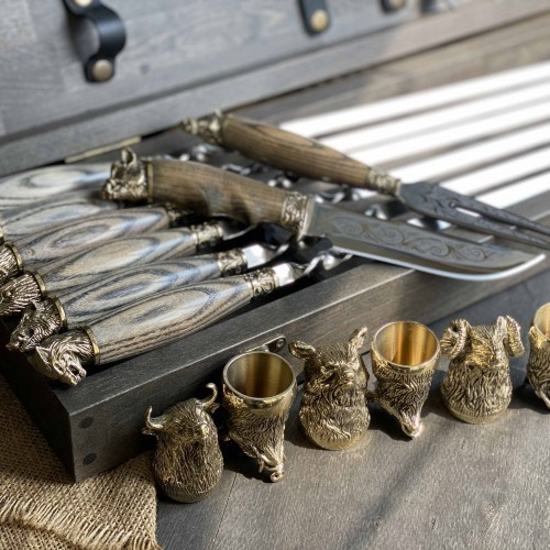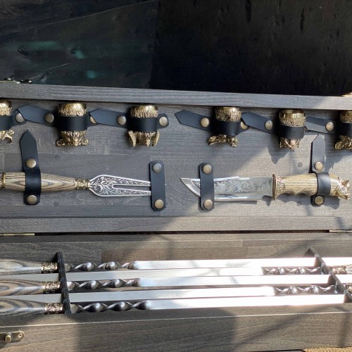1. Шампура: 6 штук, твердая пищевая нержавеющая сталь толщиной 3 мм. Длина шампура: общая – 60 см; рабочая -40 см Рукоятка: ювелирное художественное литье из бронзы (при использовании ручка не нагревается) дерево-ясень.