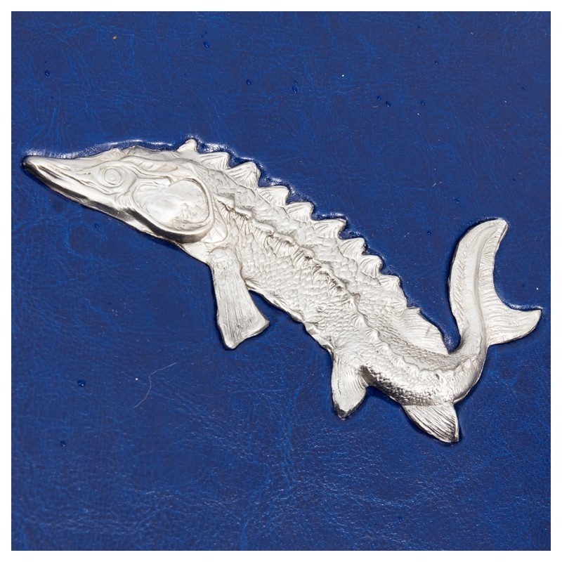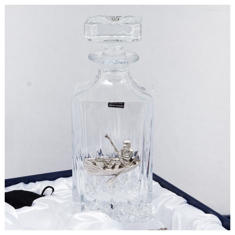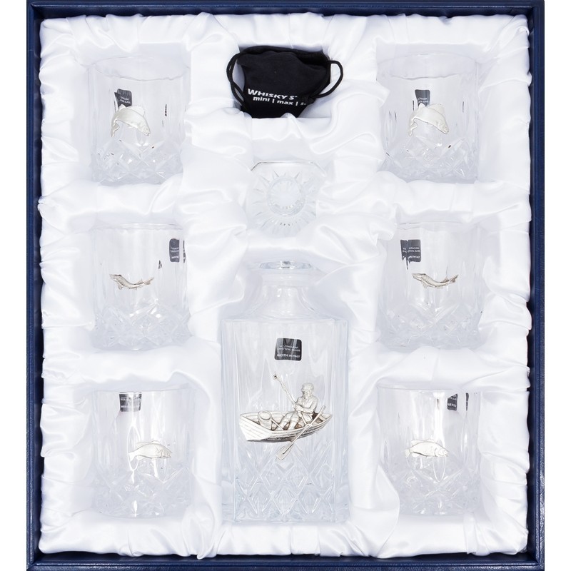 В состав набора входят штоф и 6 бокалов под виски, декорированные Рыбак в лодке и щука из настоящего серебра (проба 925)а также  золота , в подарочной кожанной упаковке.