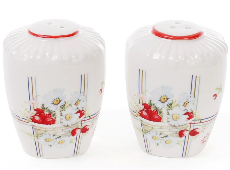 Набор спецовников (соль/перец) из коллекции фарфоровой посуды Земляничная фантазия. Белоснежный фарфор с полной корзинкой земляники и полевых цветов красная кайма. Настоящее украшение и удобная сервировочная посуда для ценителей уютного домашнего застолья. В наборе 2 спецовника для соли и молотого перца. Диаметр одного спецовника 5.5см, высота 6.5см. Набор упакован в фирменную цветную принт-коробку.