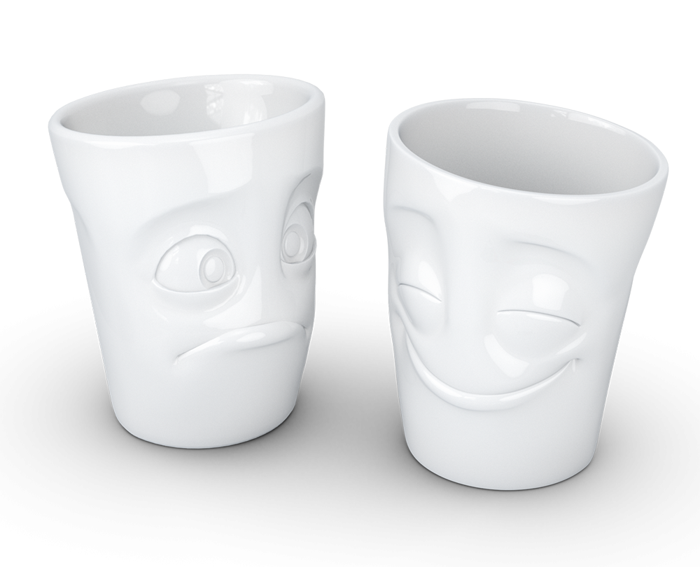 Набір складається з двох кухлів Cheery та Baffled без ручок. Гуртки зроблені з міцного білого фарфору. Обидві мають об'єм 350 мл. Їх можна нагрівати в мікрохвильовій печі та мити в посудомийній машині. Ідеальні для кави, чаю чи гарячого шоколаду у великій кількості. Крім того, креативні цінителі експресивних кухлів від 58Products використовують їх у різних цілях: наприклад, як підставки для олівців. Набір продається в ексклюзивній упаковці.
