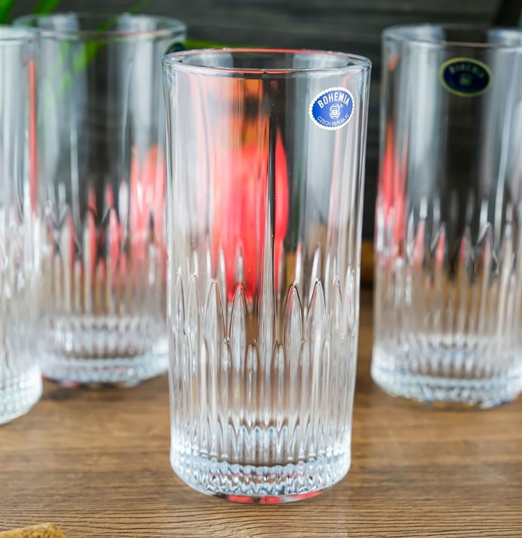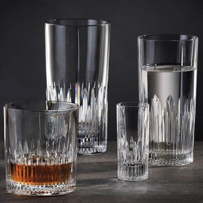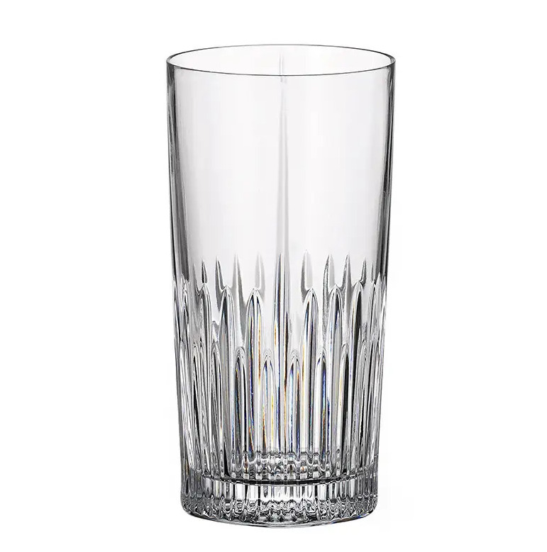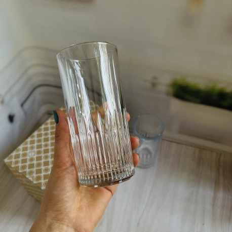 Главным элементом декора коллекции является рельефный узор, напоминающий расходящиеся вверх лучи света. Этот дизайн создает эффект игры света и тени, усиливая блеск и прозрачность стекла. Узкие линии, начинающиеся у основания, плавно расширяются вверх, придавая изделию динамику и глубину. Строгая цилиндрическая форма с гладкими краями делает эти изделия универсальными для любой сервировки – от классической до современной.