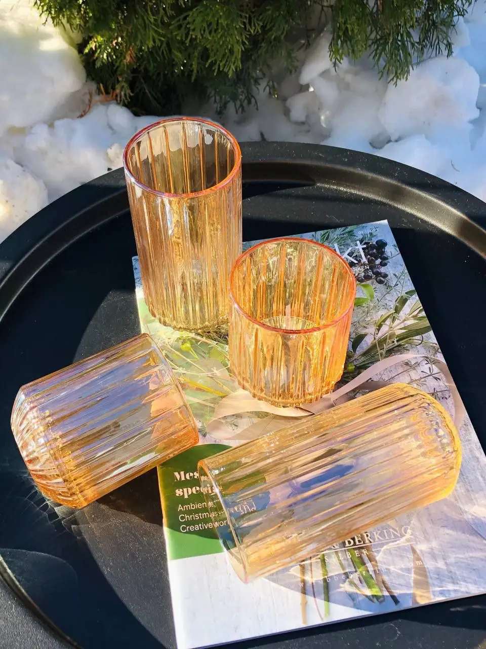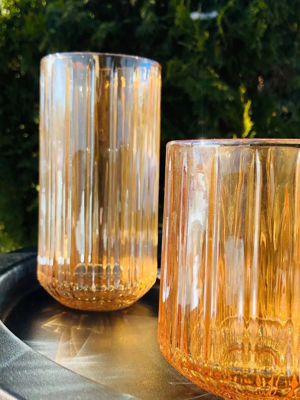 Простая форма, янтарный оттенок и выразительная вертикальная текстура создают гармоничное сочетание уюта и современного дизайна. Эти стаканы подходят как для ежедневного использования, так и для сервировки стола на приём гостей.