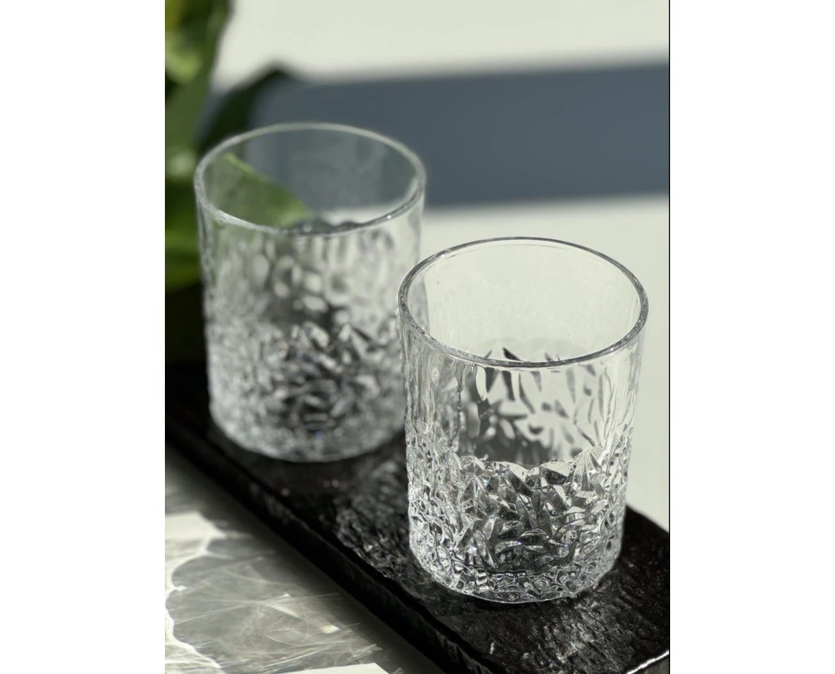 Форма стаканов универсальна: они подойдут как для подачи прохладительных напитков, так и для сервировки коктейлей или сока. Толстое дно придаёт устойчивость и подчеркивает массивность, что делает их практичными в ежедневном использовании. Гранёная поверхность красиво преломляет свет, особенно при наполнении — напитки в таких стаканах выглядят особенно аппетитно.