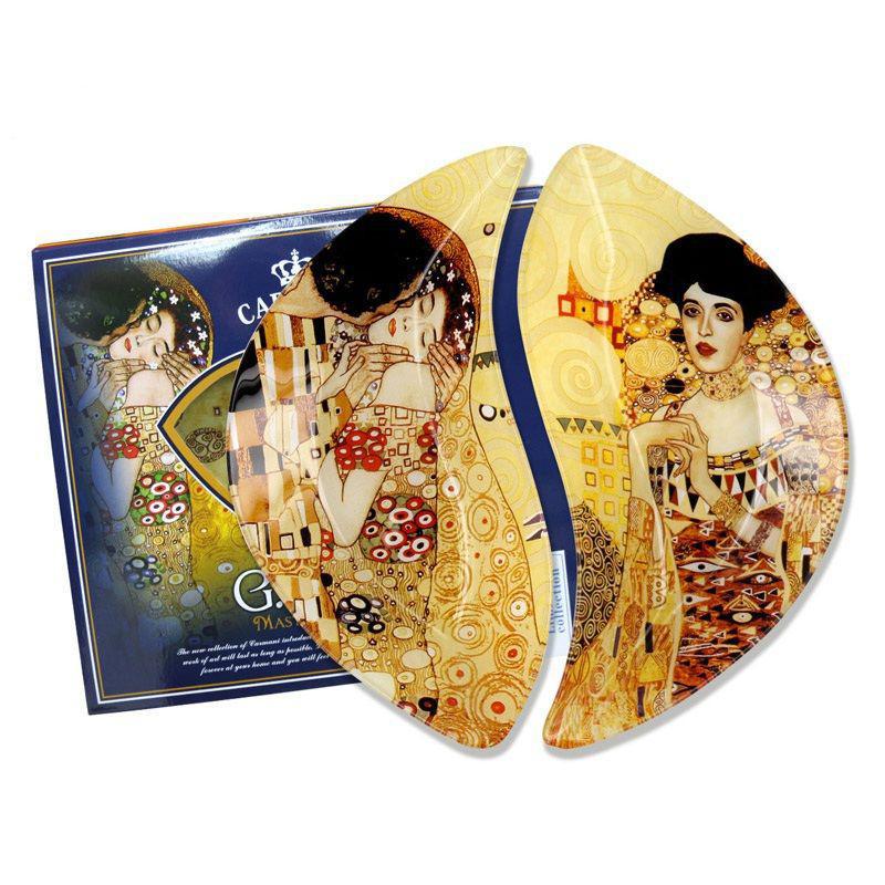 Этот набор — находка для ценителей искусства и стильных акцентов в доме. Две асимметричные стеклянные тарелки с репродукциями легендарных работ Густава Климта — «Поцелуй» и «Адель Блох-Бауэр» — поражают выразительными красками и утончённым дизайном с золотыми мотивами.