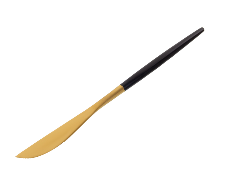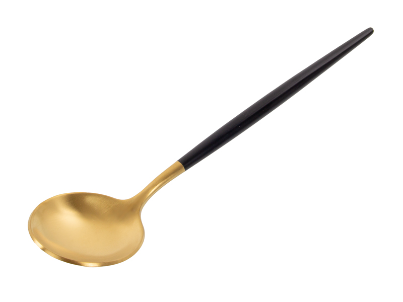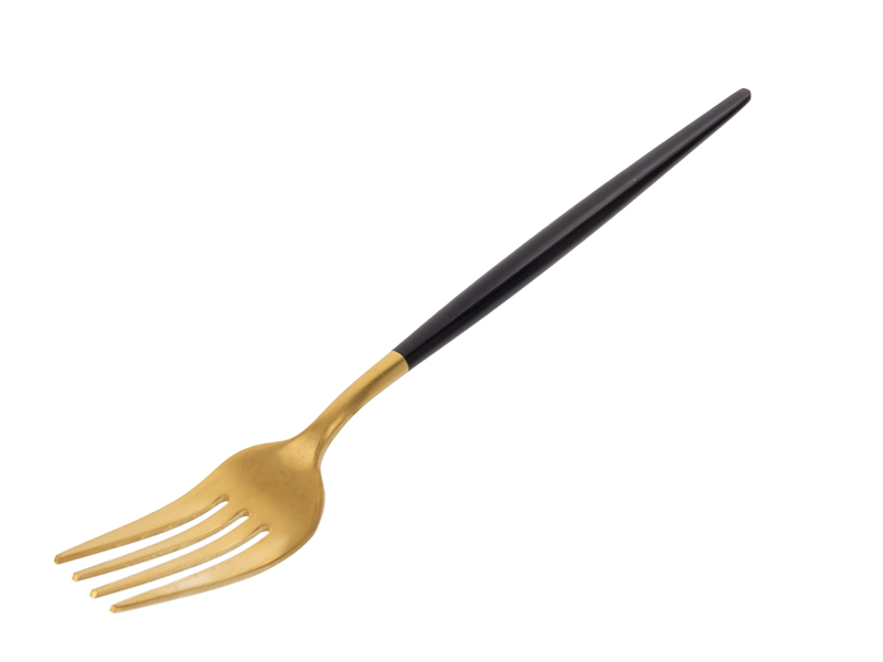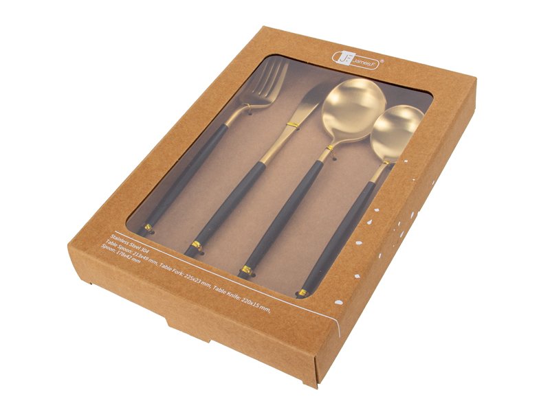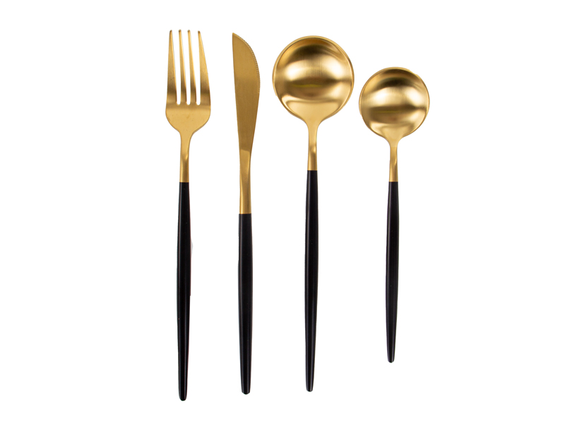 Елегантний набір столових приборів на 4 персони — це ідеальне поєднання сучасного стилю та практичності. Золотаве покриття робочої частини та глибокий чорний колір ручок створюють розкішний контраст, перетворюючи звичайний прийом їжі на естетичне задоволення.