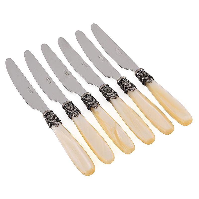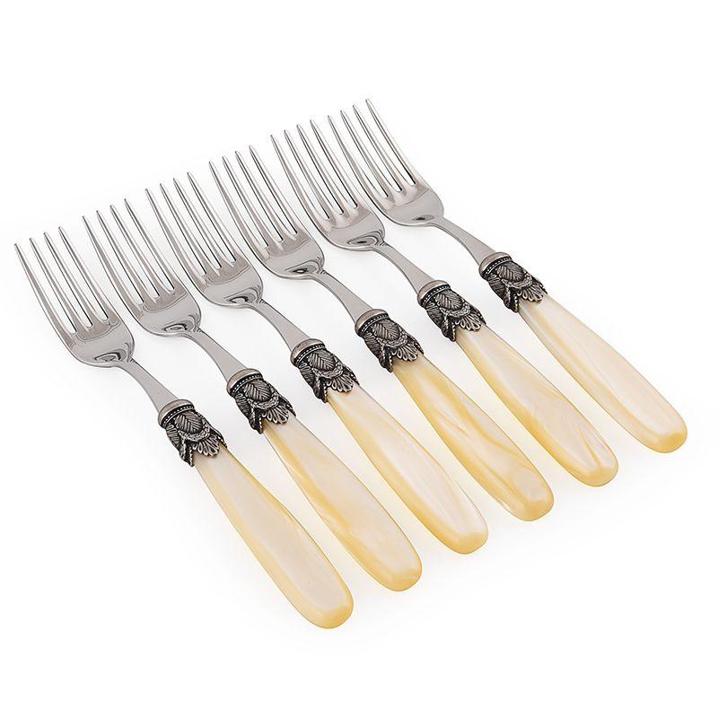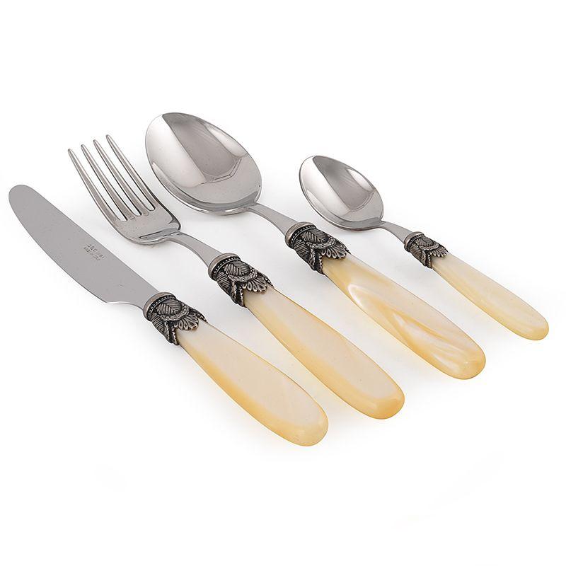Острів Іск'я - ця перлина Італії надихнула майстрів бренду Domus&Design на створення унікальної колекції елітних столових приладів. Родзинкою витонченого дизайну стали металеві пелюстки чудового декору, що прикрашає верхню частину перламутрових ручок.