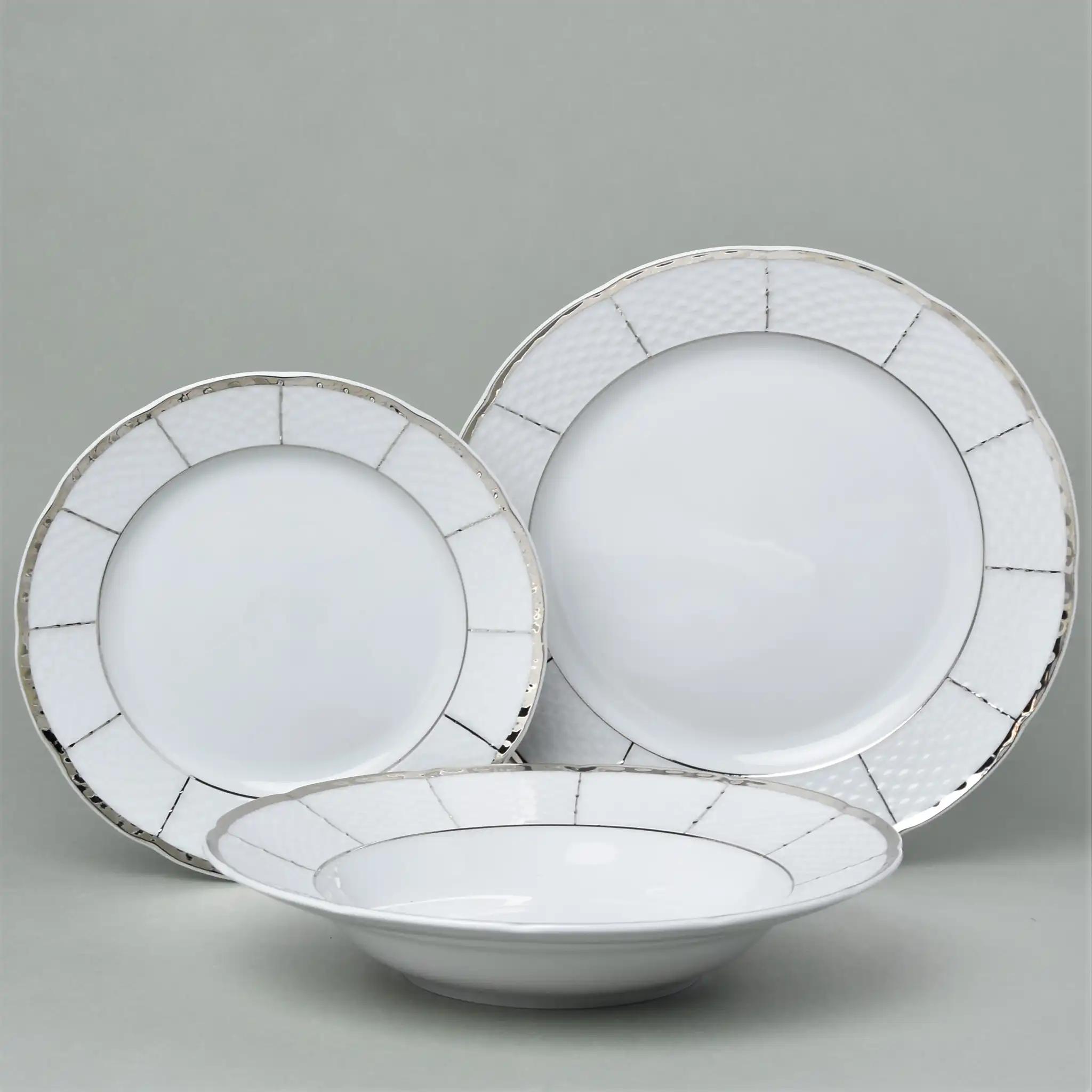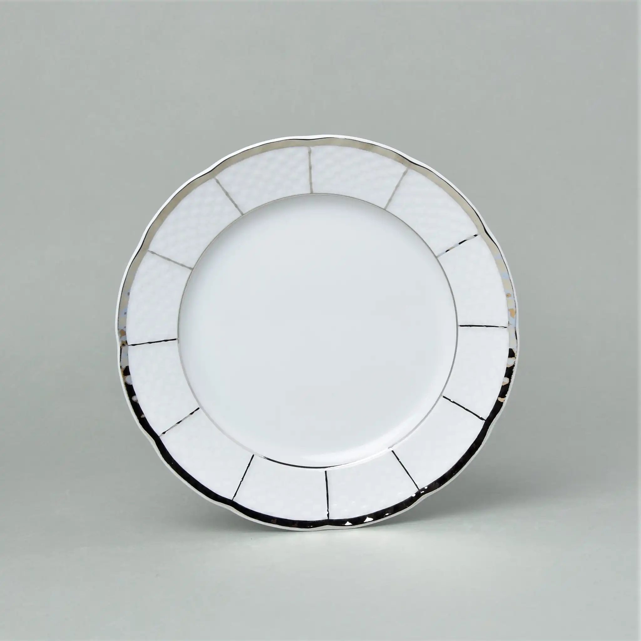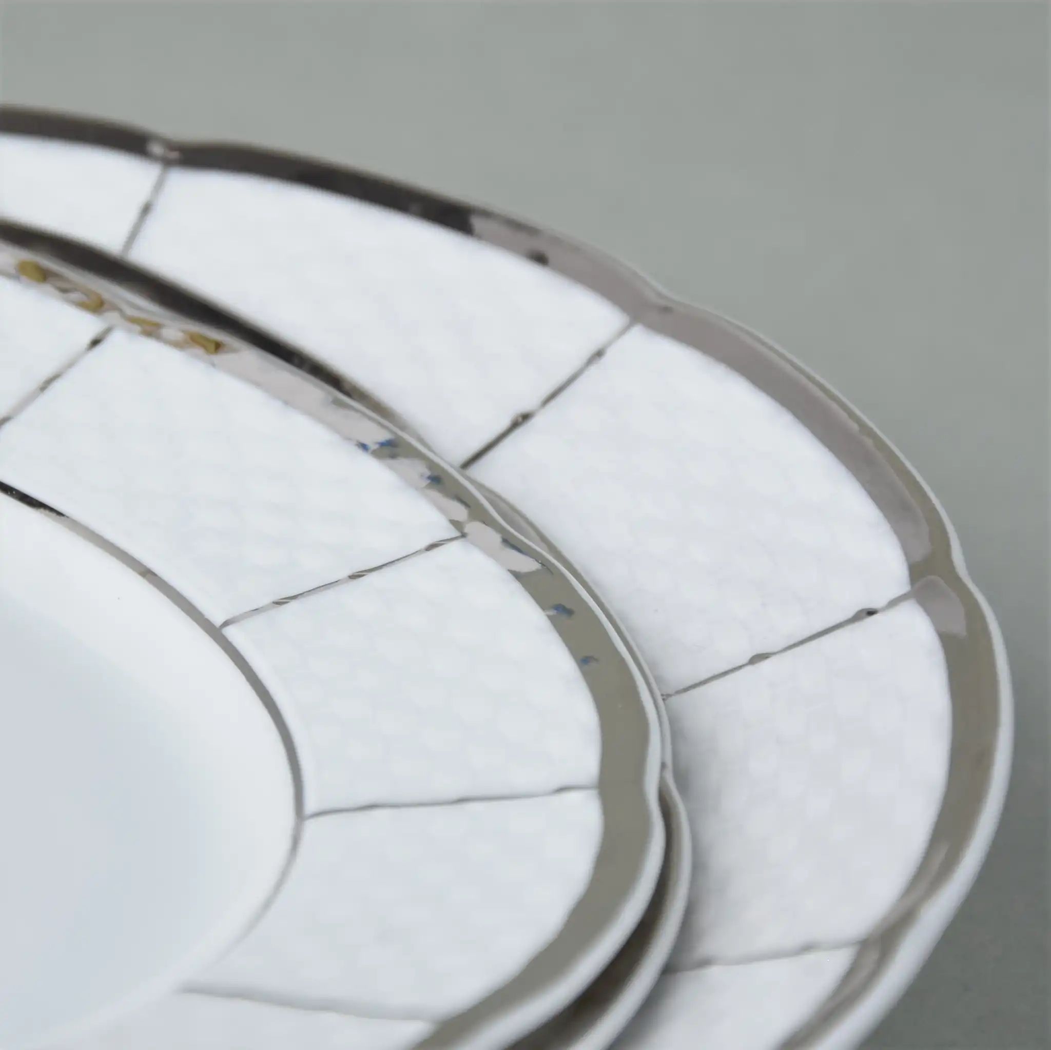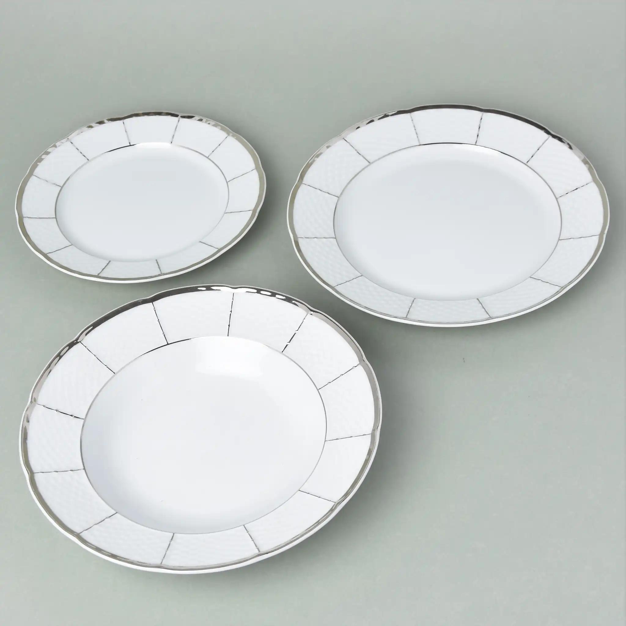 Каждая тарелка украшена утончённой платиновой каймой, которая элегантно обрамляет сияющий белоснежный фарфор. Такой декор подчёркивает благородство и добавляет выразительности — посуда выглядит дорого, но не вычурно. Она безупречно вписывается как в классический интерьер, так и в минималистичную современную подачу.