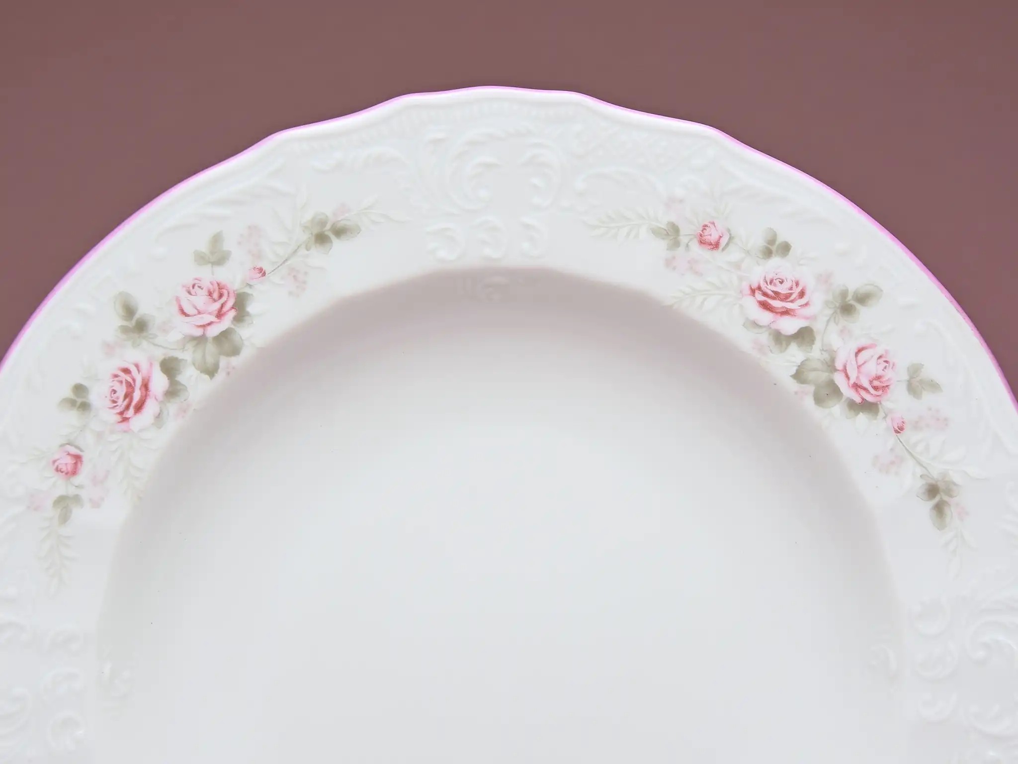 Зануртесь у витончену атмосферу класичного сервірування з набором глибоких тарілок Bernadotte "Бліді троянди з рожевим кантом" 23 см. Цей комплект із 6 порцелянових шедеврів вражає з першого погляду: білизна фарфору, плавність контурів і делікатний квітковий візерунок нагадують про старовинні королівські бенкети.