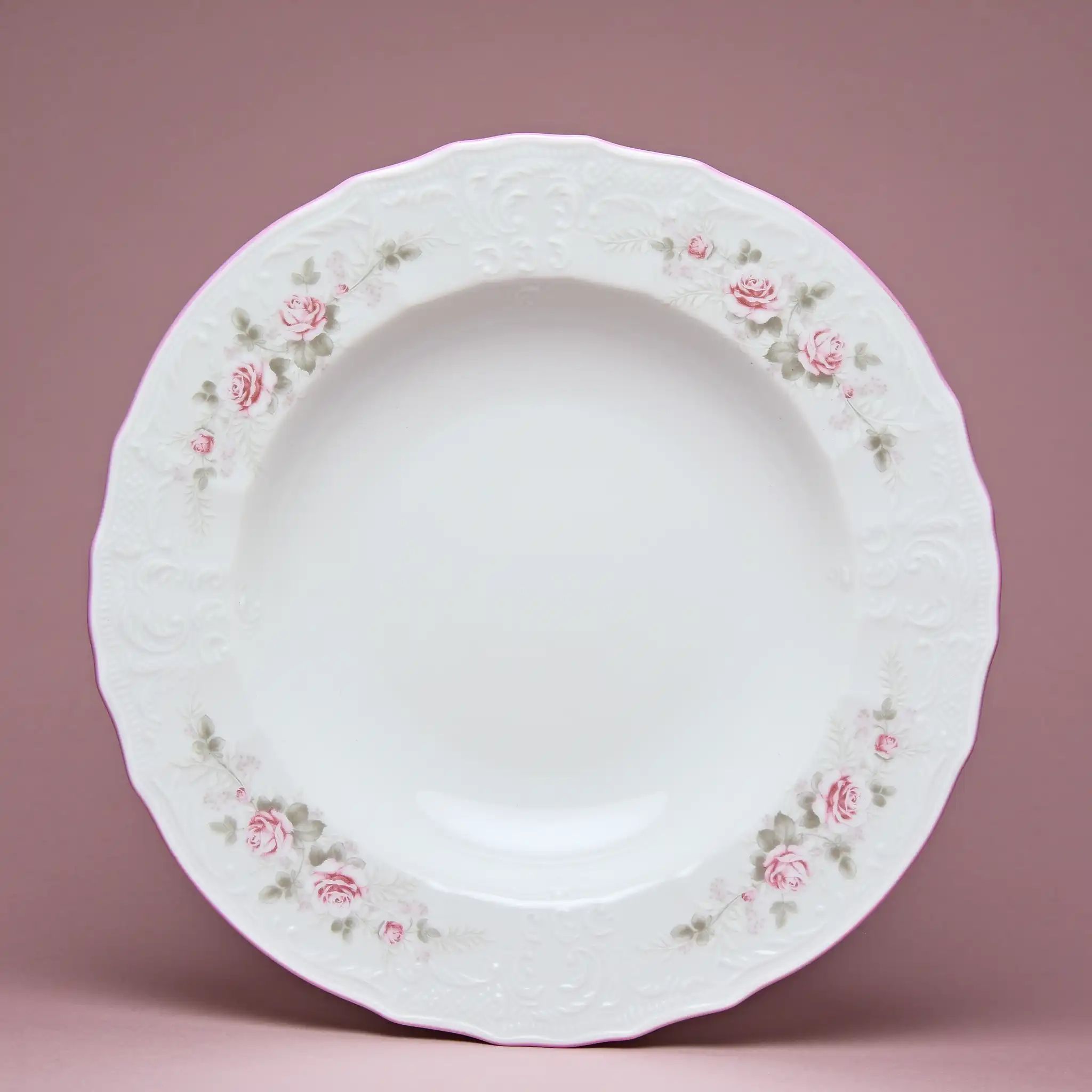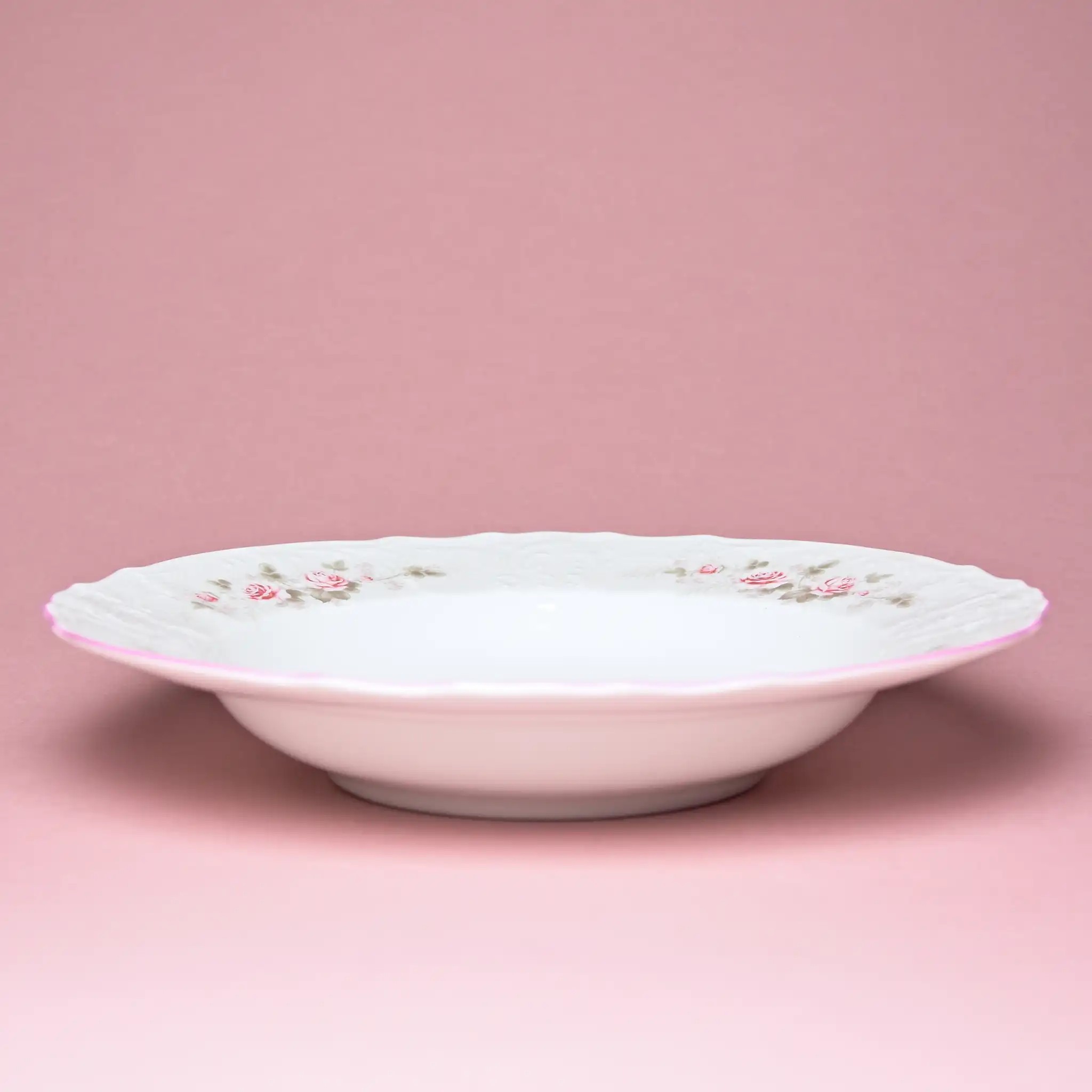 Набір порцелянових глибоких тарілок з візерунком Bernadotte "Бліді троянди" 23 см/6 шт з рожевою облямівкою