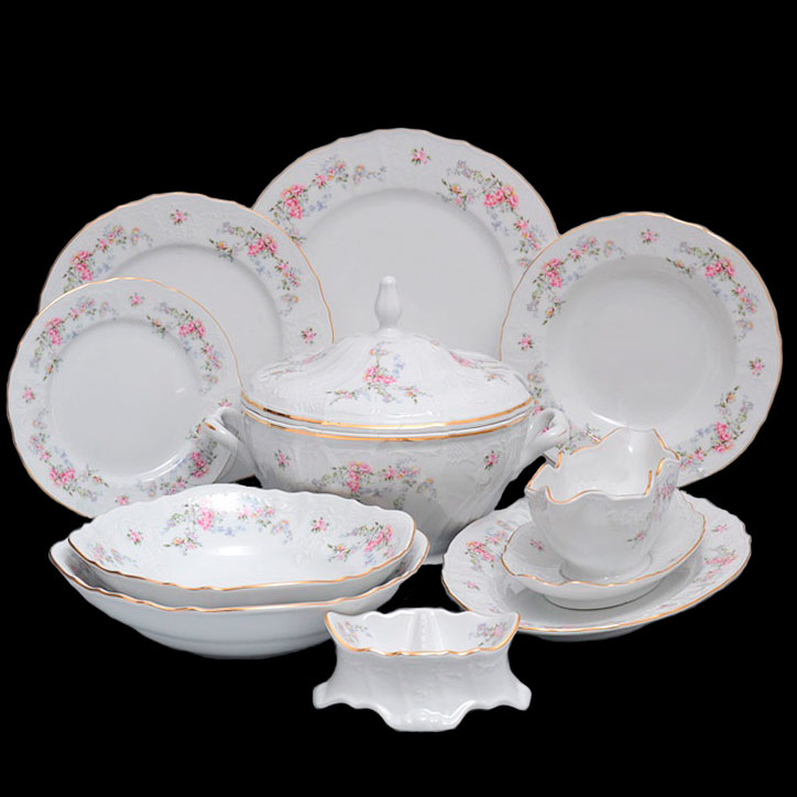 Этот набор — не просто посуда, а воплощение элегантности в фарфоре. Белоснежные тарелки украшены нежнейшим цветочным рисунком в акварельной технике и обрамлены изысканным золотым кантом. Они превращают каждую трапезу в праздник\ и придают столу особую эстетику, где даже обычный обед становится поводом для удивления.